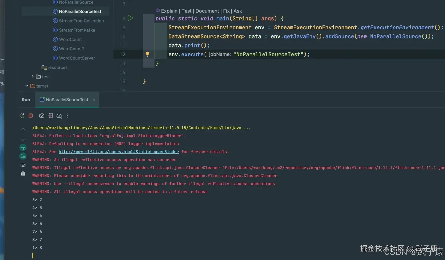在上述示例中,MyNonParallelSource 是一个简单的自定义非并行源,每秒生成一条字符串数据,并且通过 setParallelism(1) 明确指定其并行度为 1。