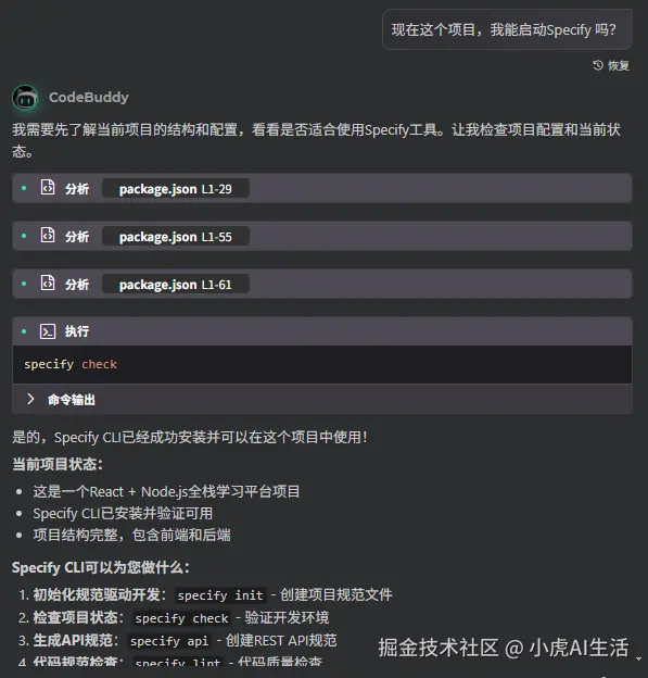 装好后我还是发懵,不知道怎么在IDE里启动,就问它"现在这个项目,我能启动Specify 吗?"