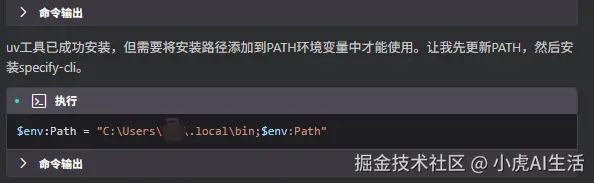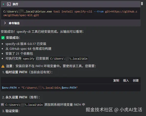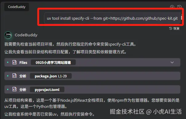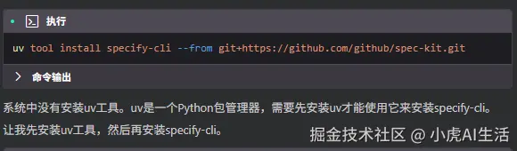 AI回答我" 我需要先检查当前项目环境,然后执行您指定的命令来安装specify-cli工具。 "。