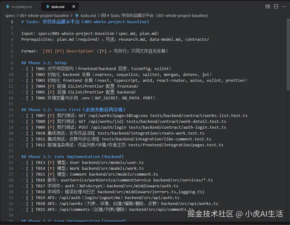 :生成可执行的任务清单 ✅,把大目标拆成小步骤。/implement