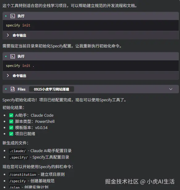 最后一句话让我放心了"总结:CLI=init/check;斜杠命令=.claude/commands;先跑 init 完成 .specify 脚手架,再用斜杠命令工作流。"