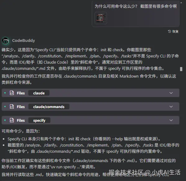 后续我还问了几个在CodeBuddy环境中缺失指令的问题"为什么可用命令这么少? 截图里有很多命令啊"