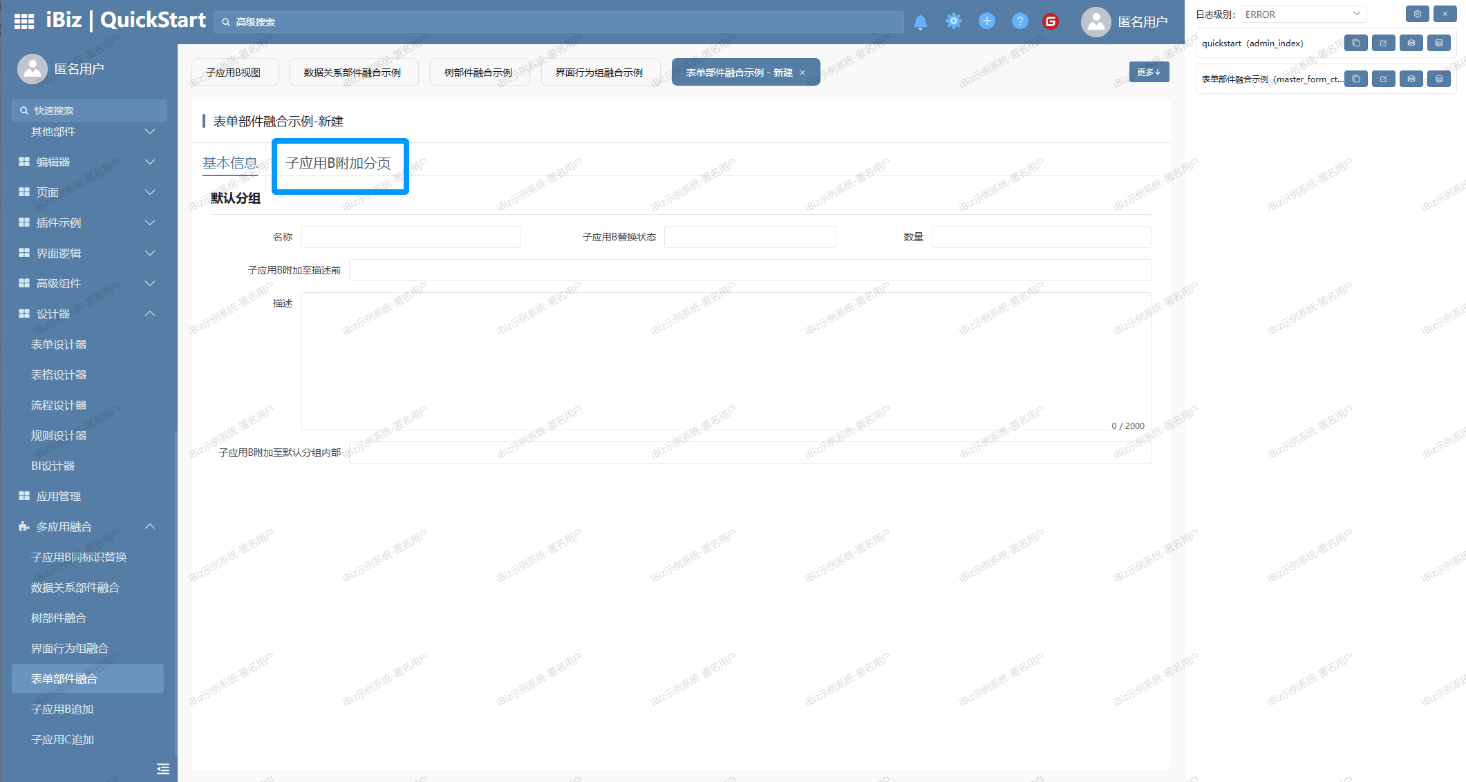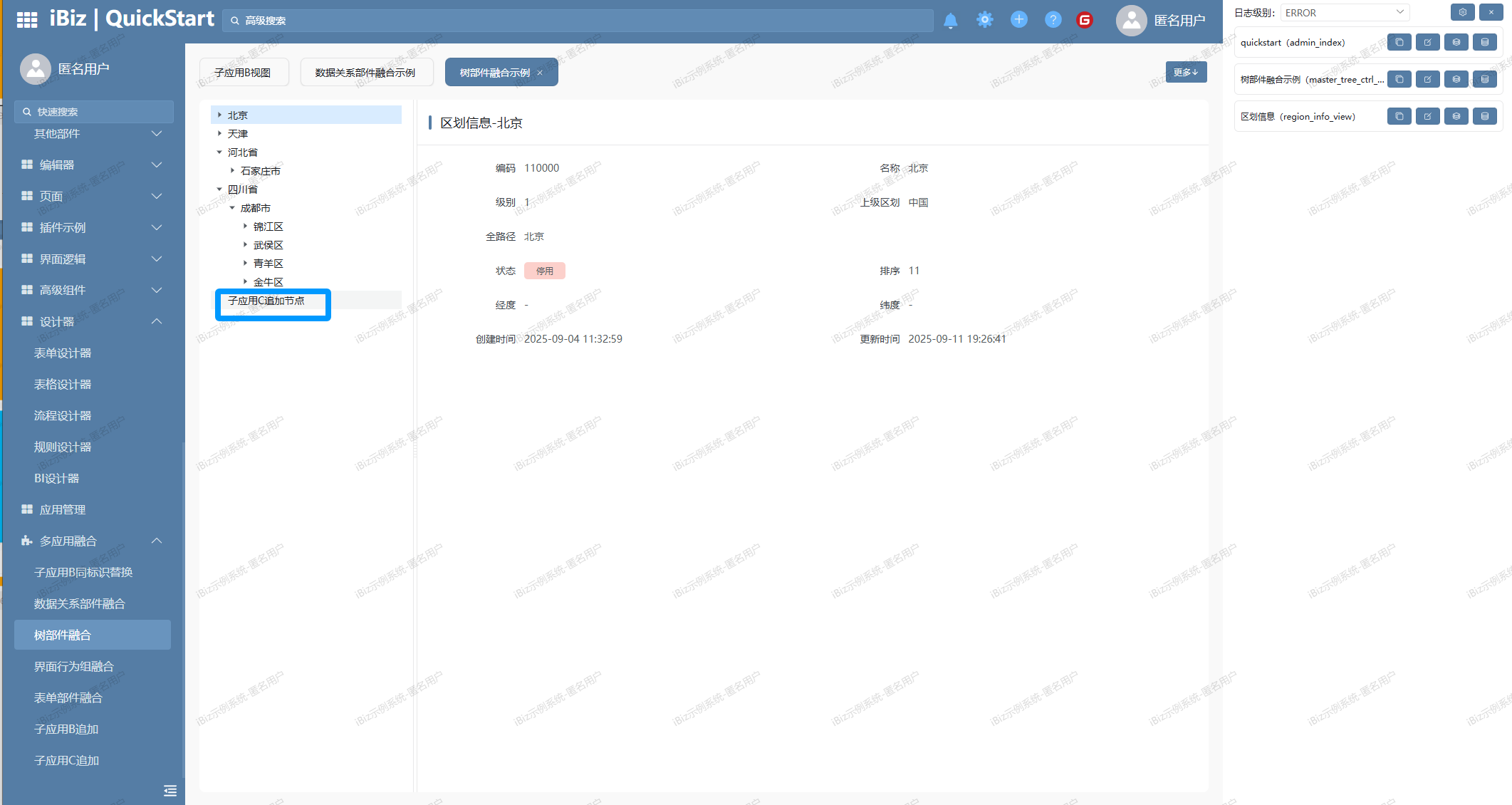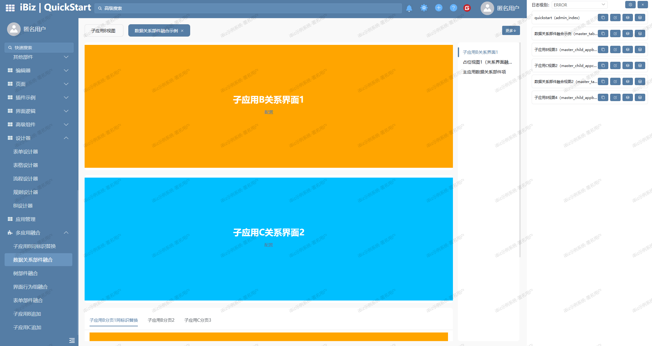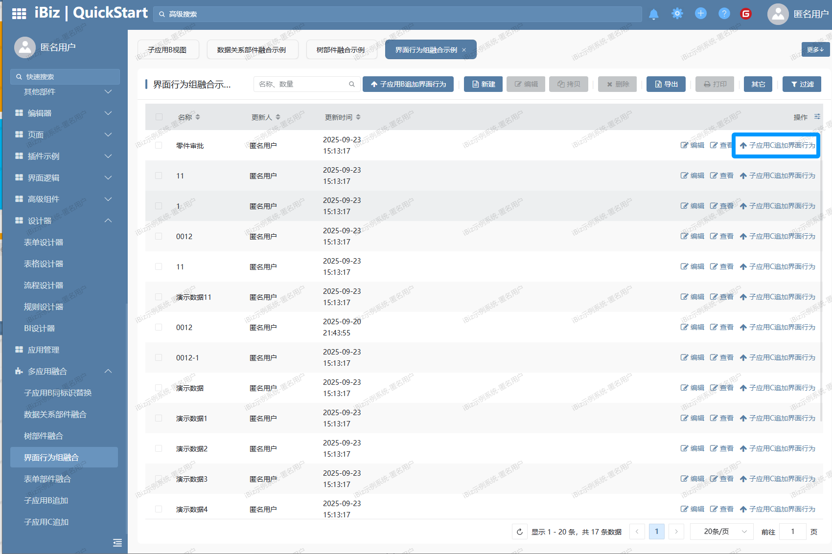 就可以看出,目前支持应用菜单、数据关系部件、树部件、界面行为组、表单等场景融合。