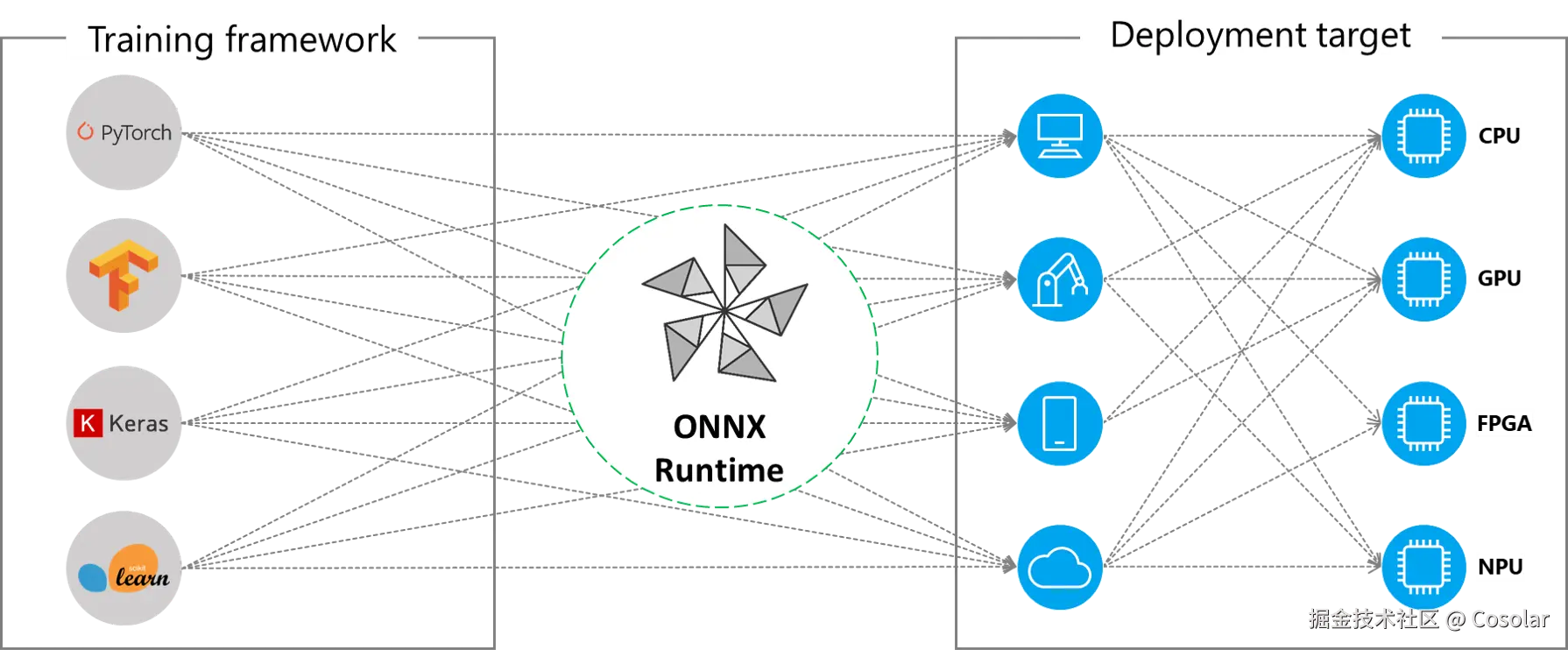 在人工智能技术飞速发展的今天,模型训练与部署之间的"鸿沟"始终是行业痛点------训练好的模型往往因框架差异、硬件限制等问题难以高效落地。而ONNX Runtime的出现,为这一难题提供了强有力的解决方案。作为微软开源的跨平台推理引擎,ONNX Runtime凭借其跨框架兼容性、全硬件加速能力和极致的性能优化,已成为AI模型部署领域的关键基础设施。本文将深入解析ONNX Runtime的核心价值、技术原理与应用场景,带你领略它如何为AI落地"加速"。