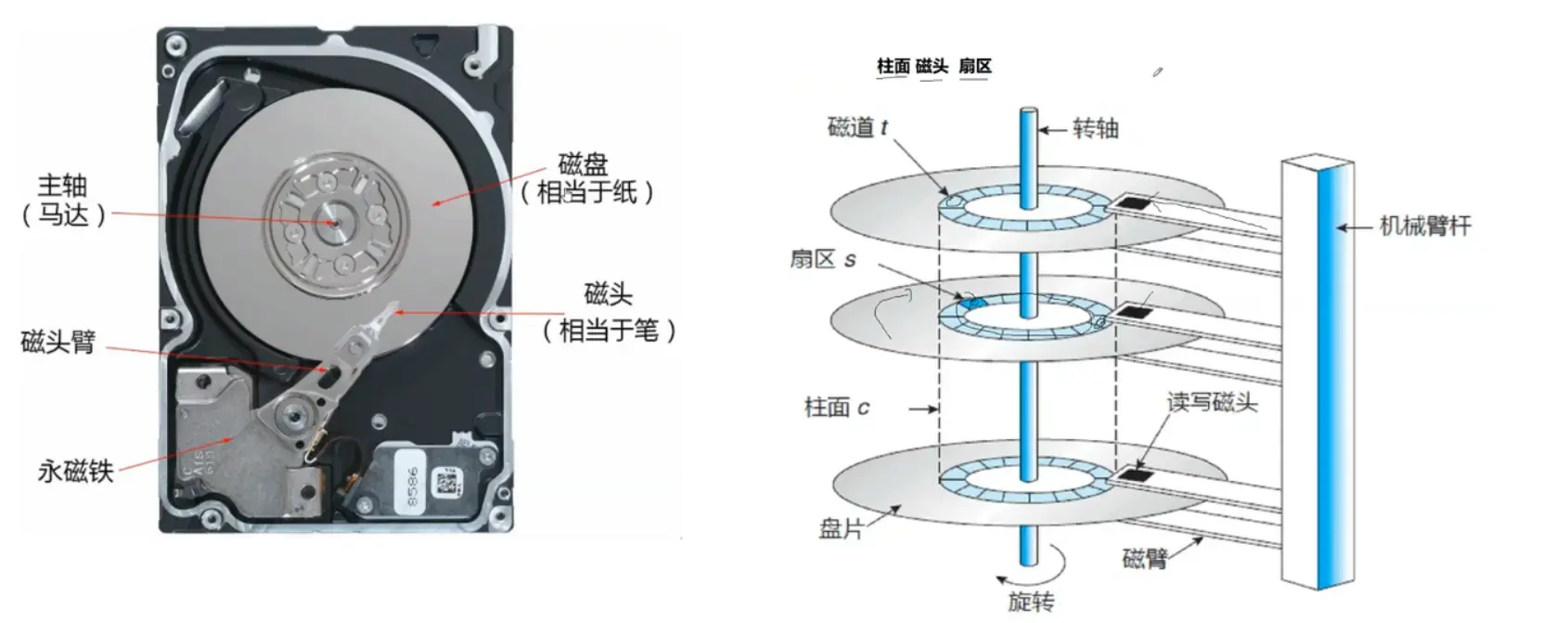 首先就是我们的操作系统课本上面学习的这个磁盘的基本结构,比如下面的这个磁盘,磁头,磁头臂以及柱面,扇区的相关的概念;
