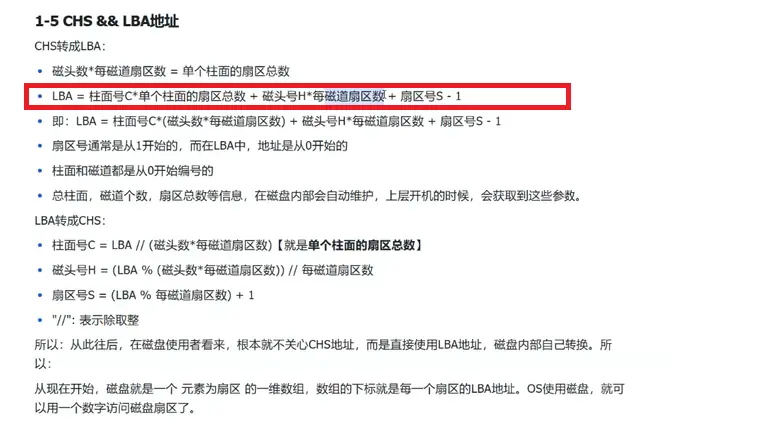 操作系统实际上使用的就是 LBA 地址,但是这个 CHS 地址和 LBA 地址之间的相互转换,也是操作系统自己完成的,具体的转换方法如下所示,比较抽象,需要自己去理解: