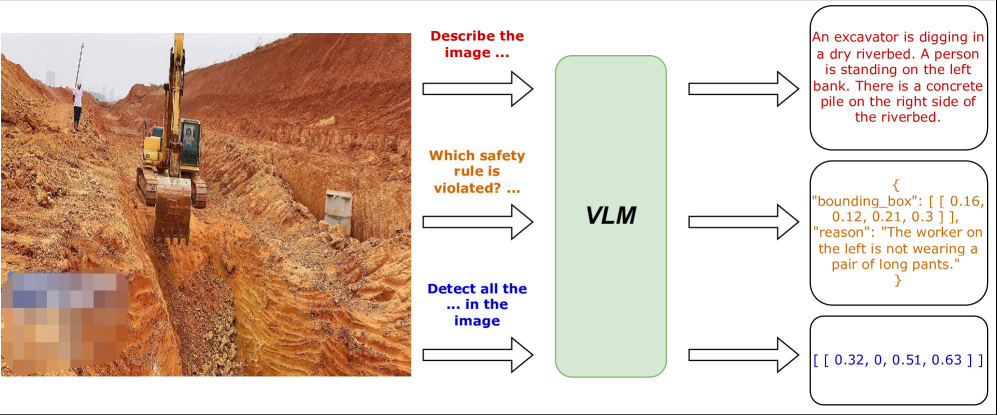 随着强大视觉语言模型(VLMs)的兴起,研究人员开始探索其在从现场图像中检测安全规则违规行为等任务中的应用。本文提出 ConstructionSite 10k 数据集,包含 10,000 张施工现场图像,并为三个相互关联的任务提供标注,包括图像描述生成、安全规则违规视觉问答(VQA)以及施工元素视觉定位(visual grounding)。