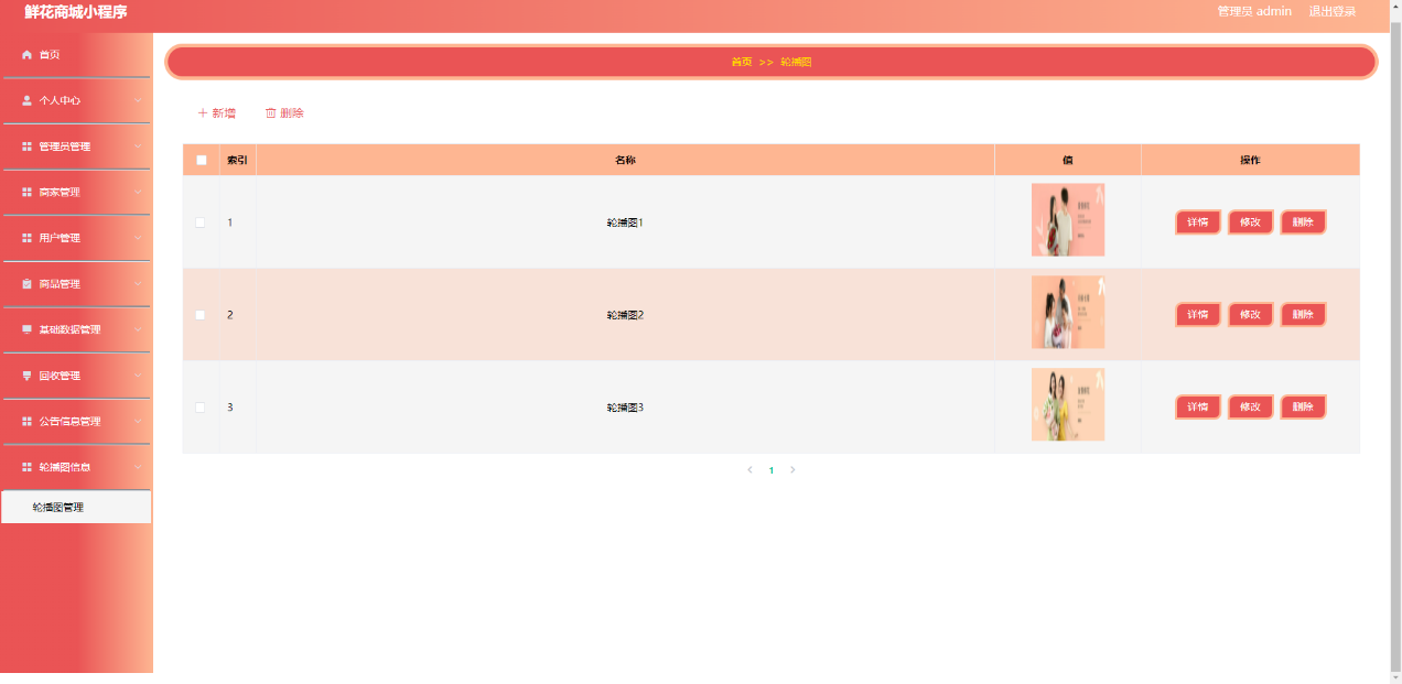 如图5.1.7显示的是轮播图管理页面,功能有:根据轮播图信息进行新增、修改、查询操作等。