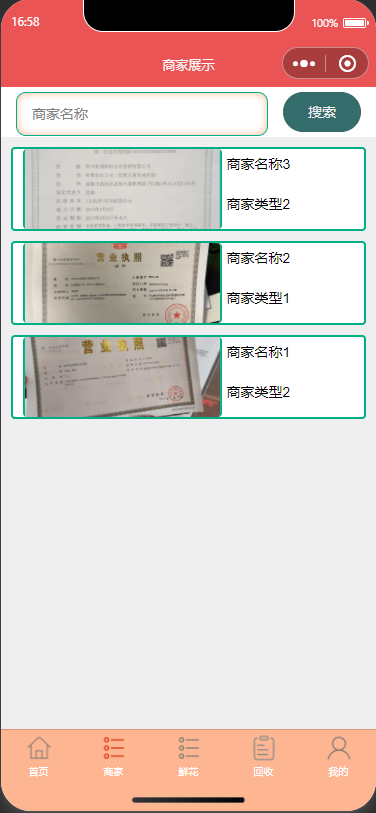 如图5.1.5显示的是商家页面,功能有:查看、修改已发布的商家信息,商家信息作废即可删除,数据库将不再存储该数据。