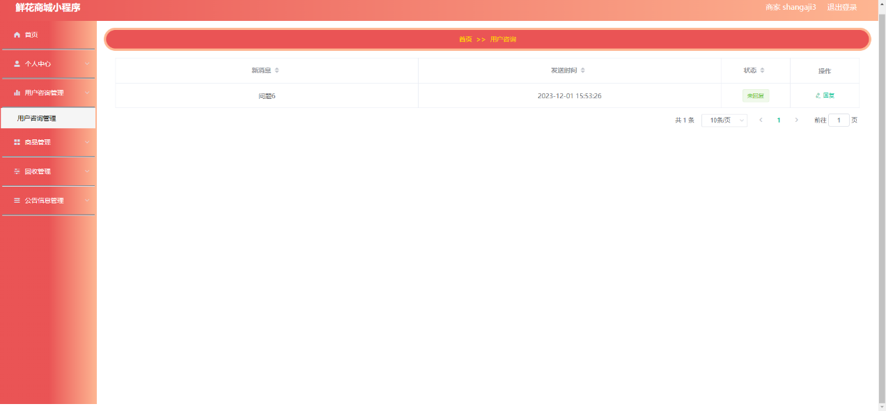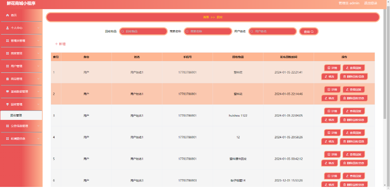 如图5.2.4显示的是回收信息管理页面,功能有:管理员根据用户上传的回收信息进行回复、修改、查询等。