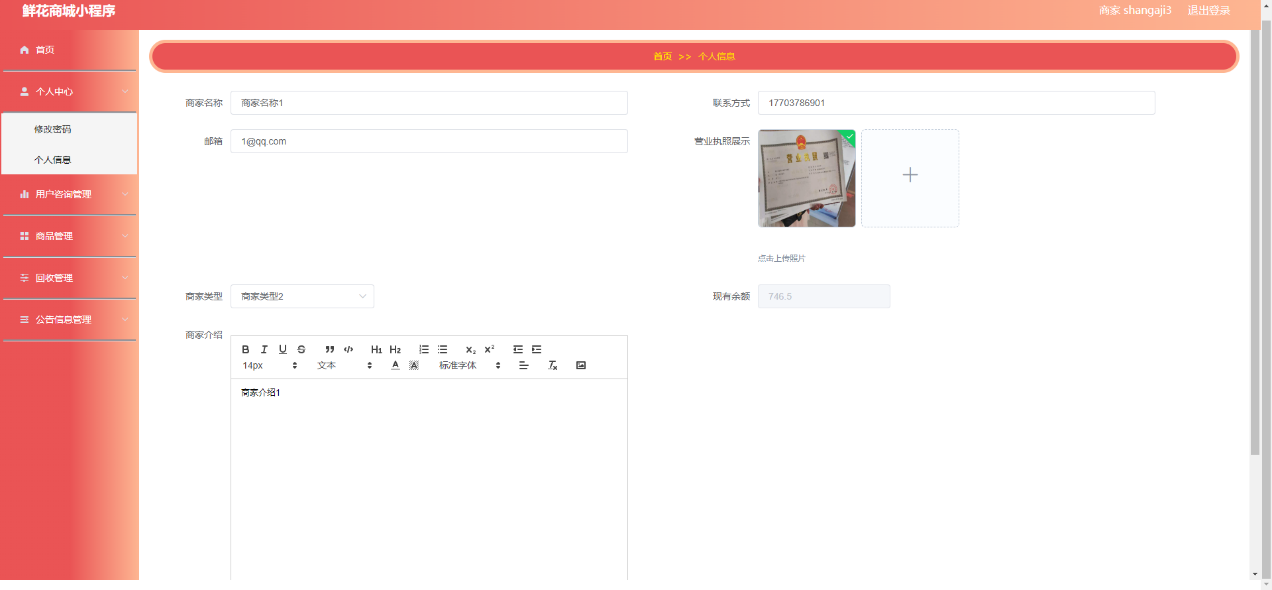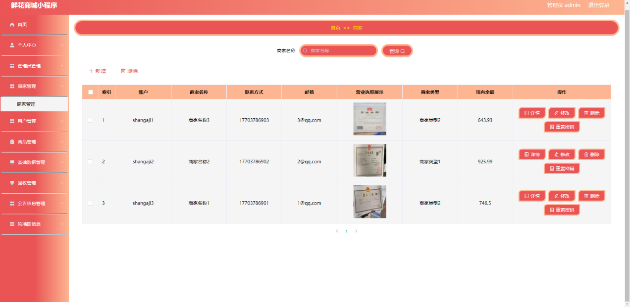如图5.1显示的是商家中心管理页面,功能有:商家信息的查询、修改、新增以及删除等。