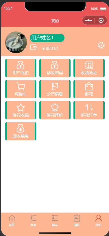 用户在个人界面可以修改和查看自己的基本信息,可以退出小程序,账号可以对该账号进行充值管理,收货地址,查看购物车等。