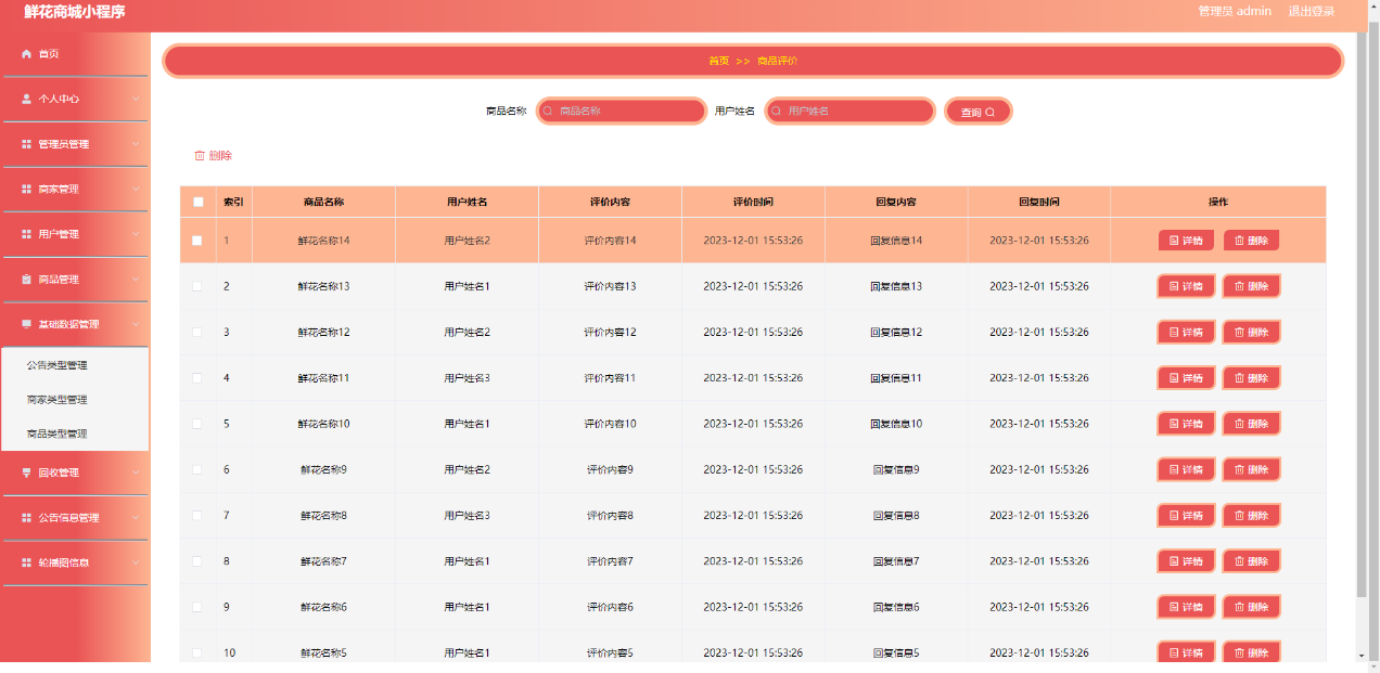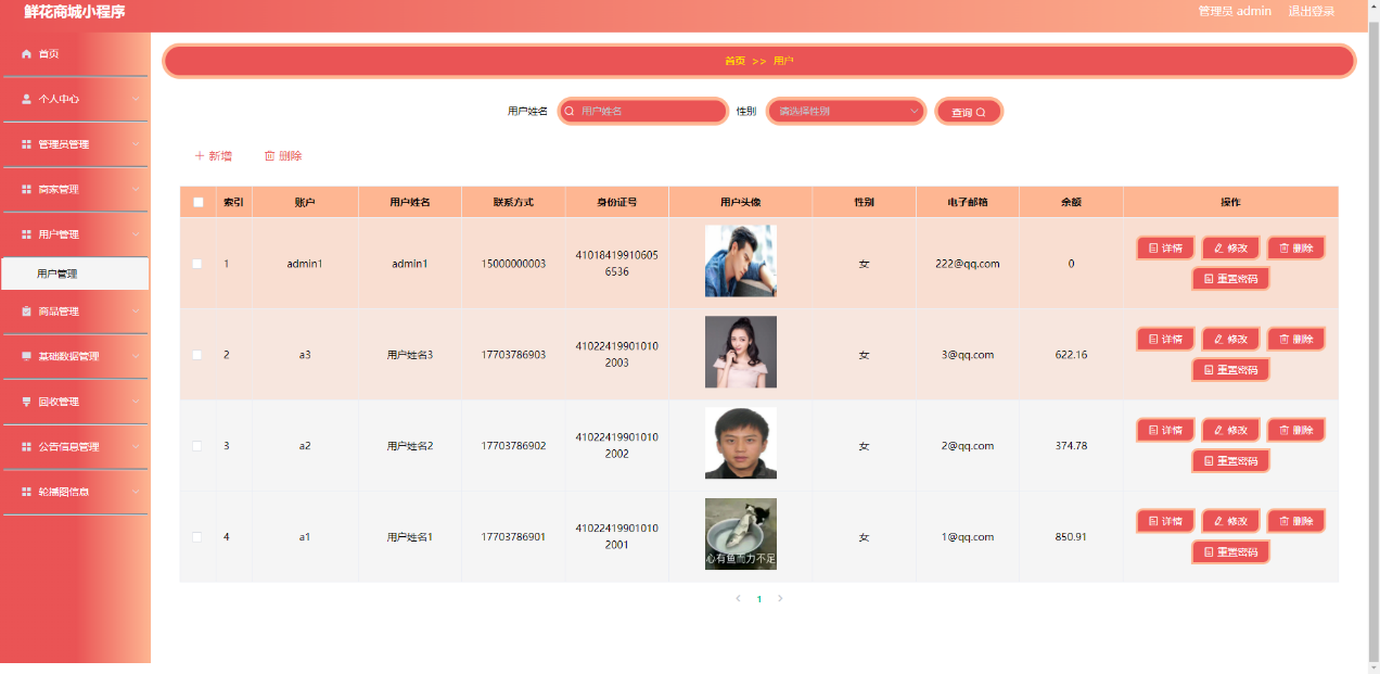 如图5.1.1显示的是用户信息管理页面,功能有:首页、个人中心、管理员及商家管理、用户管理、商品管理、用户信息增删改查等。
