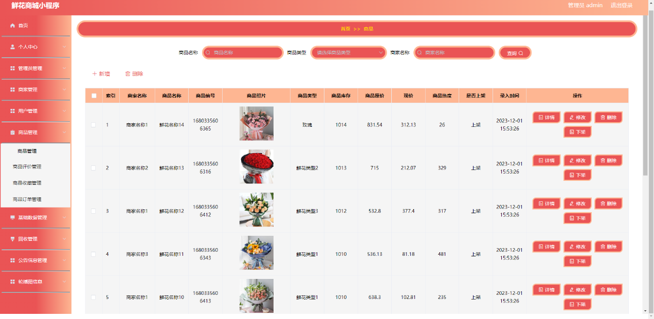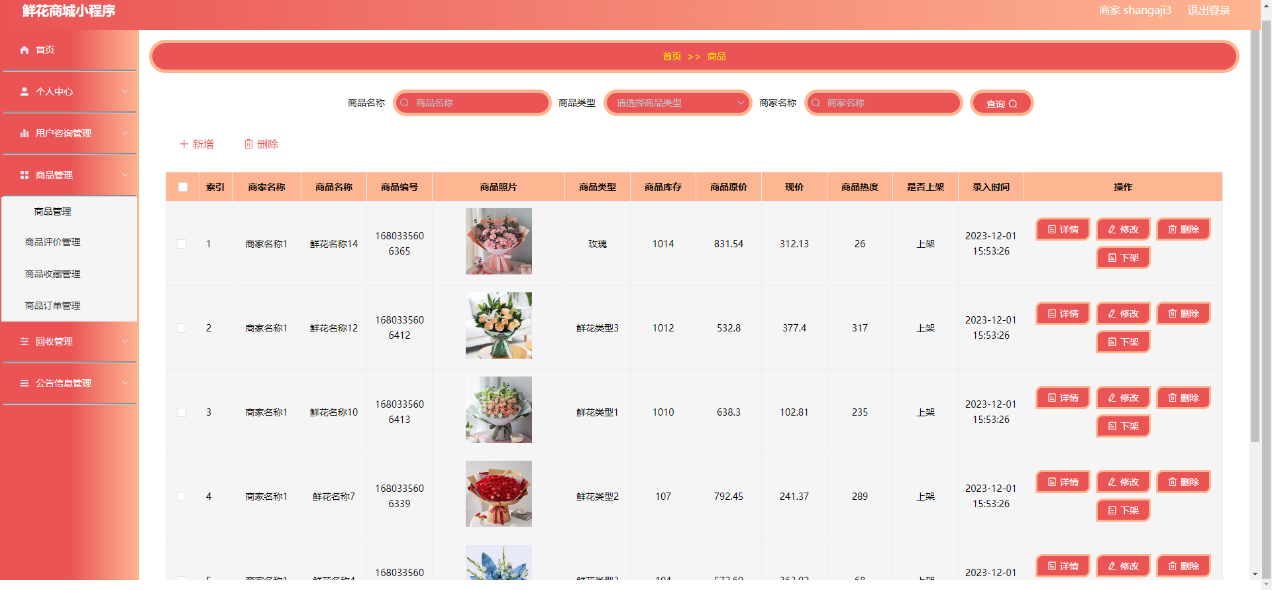 随着移动互联网的普及和人们生活品质的提高,鲜花作为一种表达情感和美化生活的物品,鲜花市场需求日益增长。传统的鲜花销售模式已经难以满足消费者日益多样化的需求,而且对于线下销售的信息管理混乱、出错率高等问题,开发一款便捷、高效的鲜花销售与回收系统显得尤为重要。本系统采用微信小程序作为前端平台,利用SpringBoot框架搭建后台系统,以及使用MySQL数据库存储用户和管理员等数据,为用户以及管理员提供了的高效便捷的鲜花购物和管理信息等服务。在系统设计方面,通过合理的界面布局和交互设计,使用户能够轻松使用小程序,管理员能够更高效的处理后台系统信息,同时小程序端还为用户提供便捷的回收功能,鼓励用户参与环保行动。鲜花销售与回收系统的开发降低了信息管理成本,实现信息管理计算机化,为鲜花行业提供了更加优质的服务。