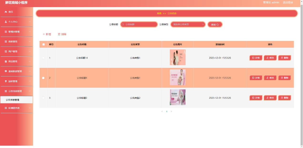 如图5.1.3显示的是公告信息管理页面,功能有:根据公告信息进行筛选,还可以对公告信息进行新增、修改、查询等。