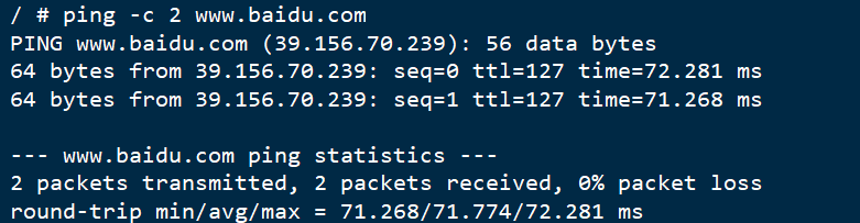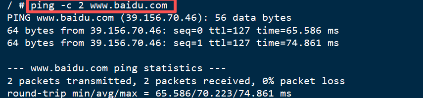 通过ping命令来连接外部网络,其中 -c 2选项限制ping命令仅尝试两次。