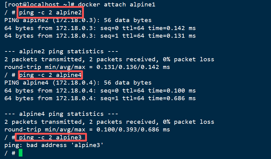 如图所示,可连通。(注:在默认桥接网络下不能通过容器名来连通alpine2)