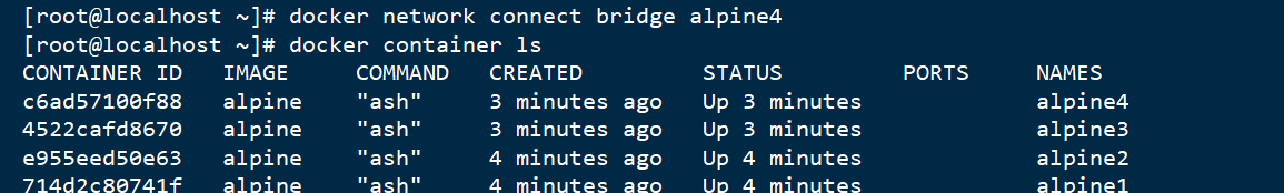 创建4个alpine容器,其中,alpine3容器只连接默认桥接网络