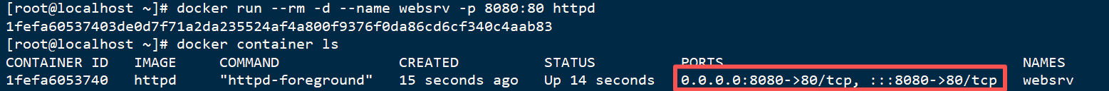 docker run --rm -d --name websrv -p 8080:80 httpd