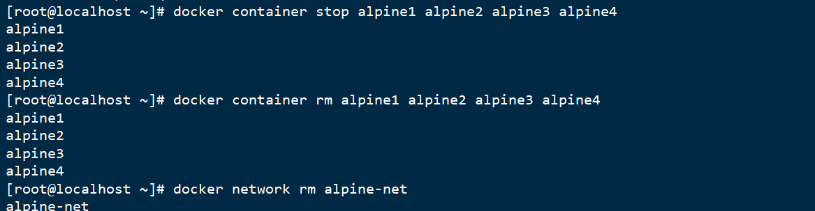 docker container rm alpine1 alpine2 alpine3 alpine4