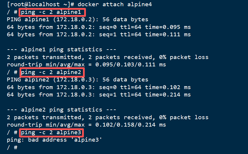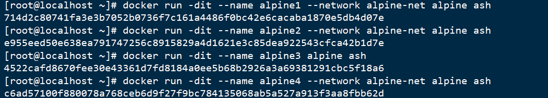 docker run -dit --name alpine4 --network alpine-net alpine ash