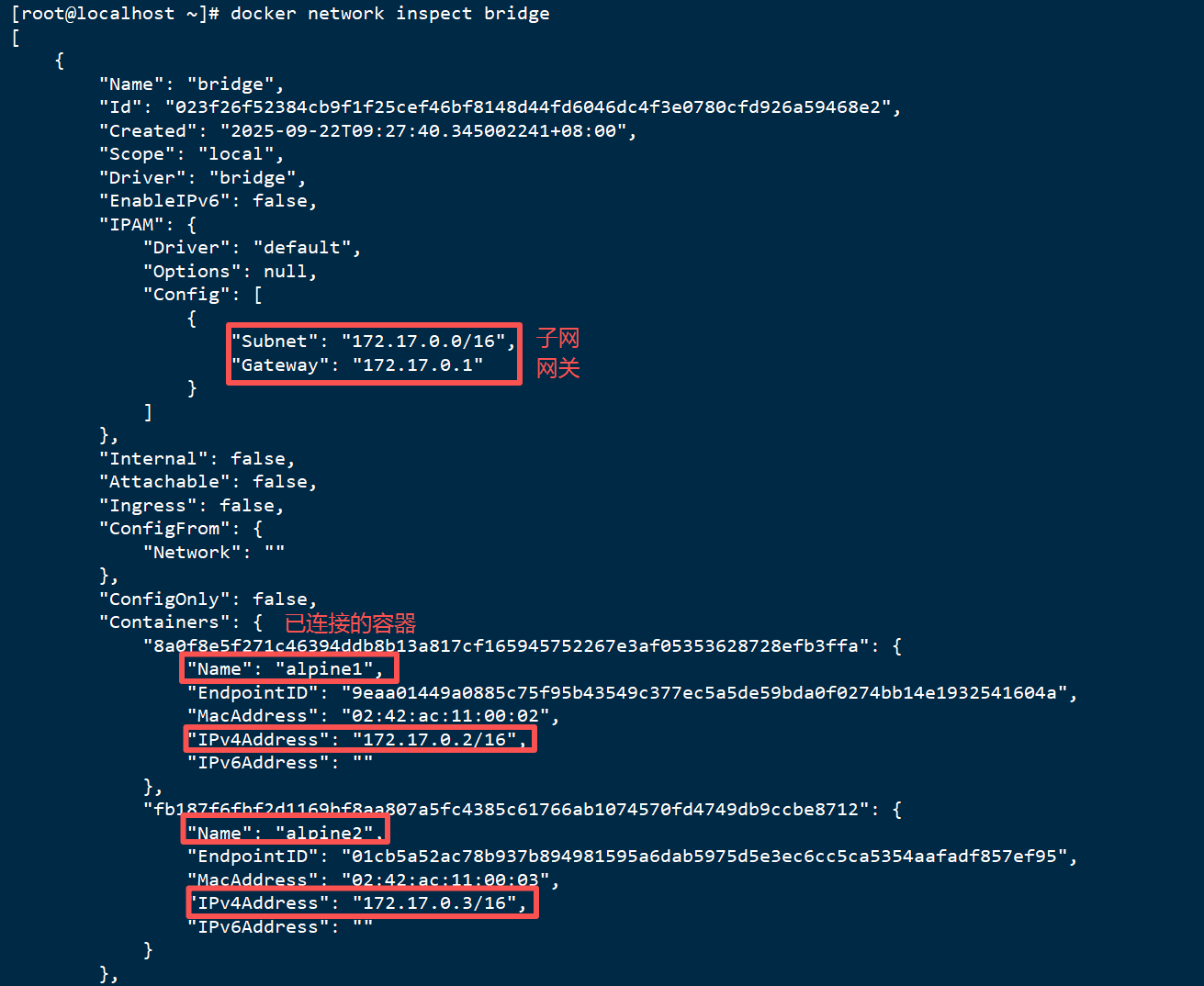 docker主机和桥接网络之间网关IP、已连接的容器的相关信息