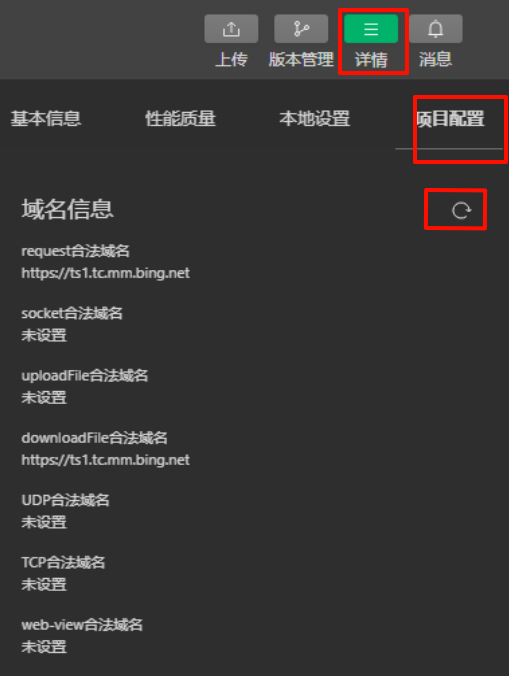 这时候需要在微信平台,进入:开发 → 开发管理 → 开发设置,找到 服务器域名 配置区域:downloadFile合法域名。然后刷新。