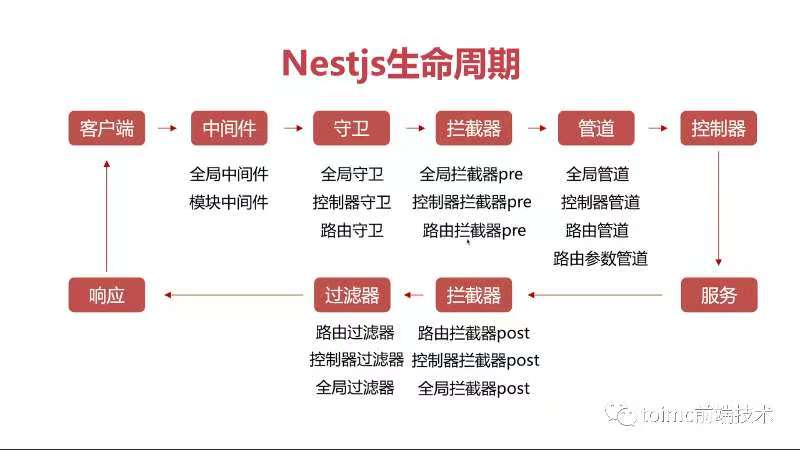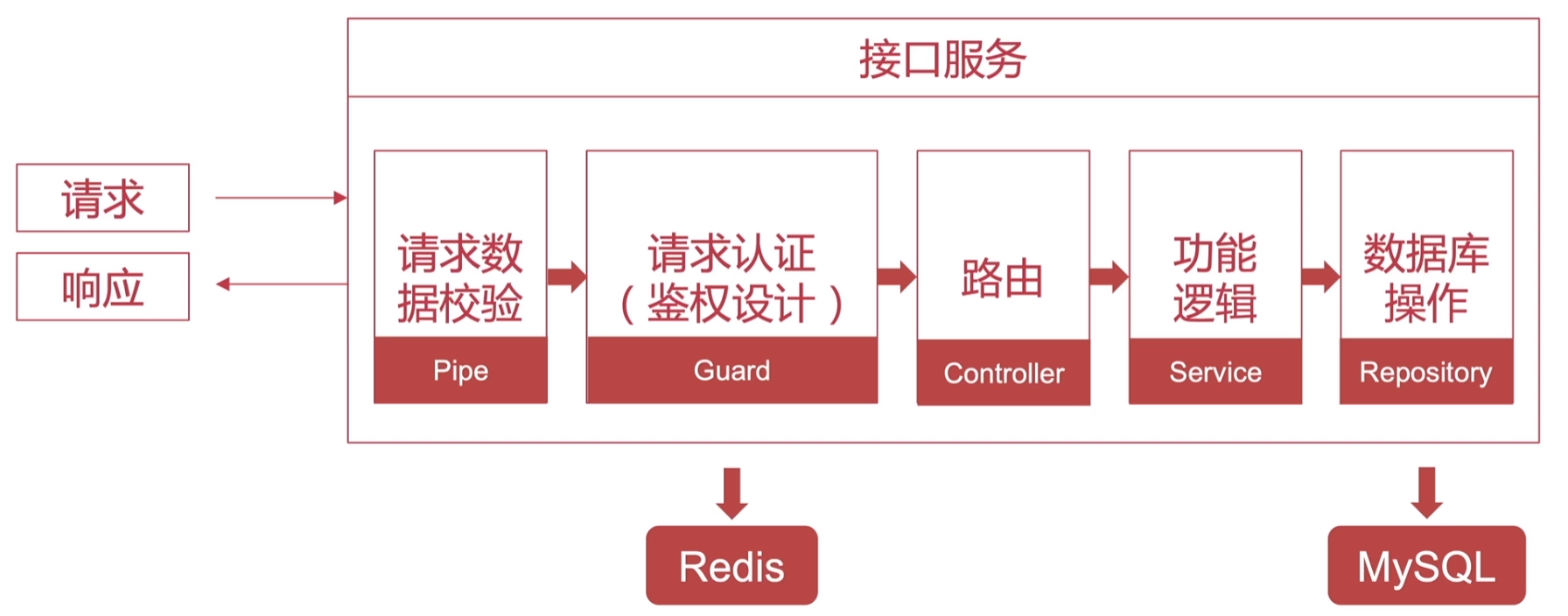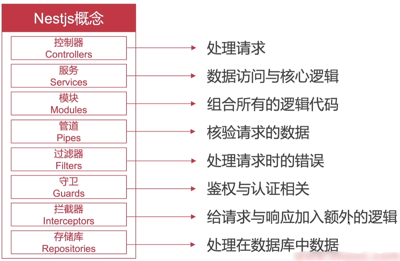 - DTO(数据传输对象): 在请求和服务中间,对于数据进行过滤,接收部分数据(比如去除敏感数据),数据属性小于等于实体。在 nest 中作为单独的一个文件夹,存放传输对象。