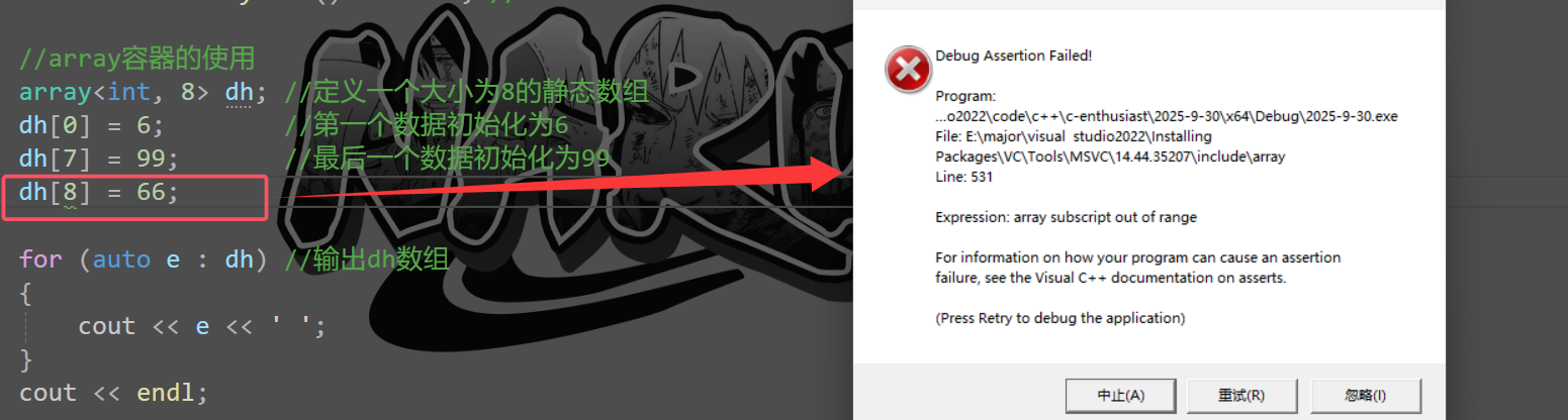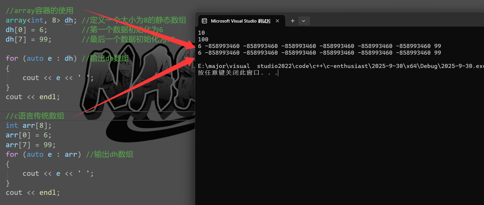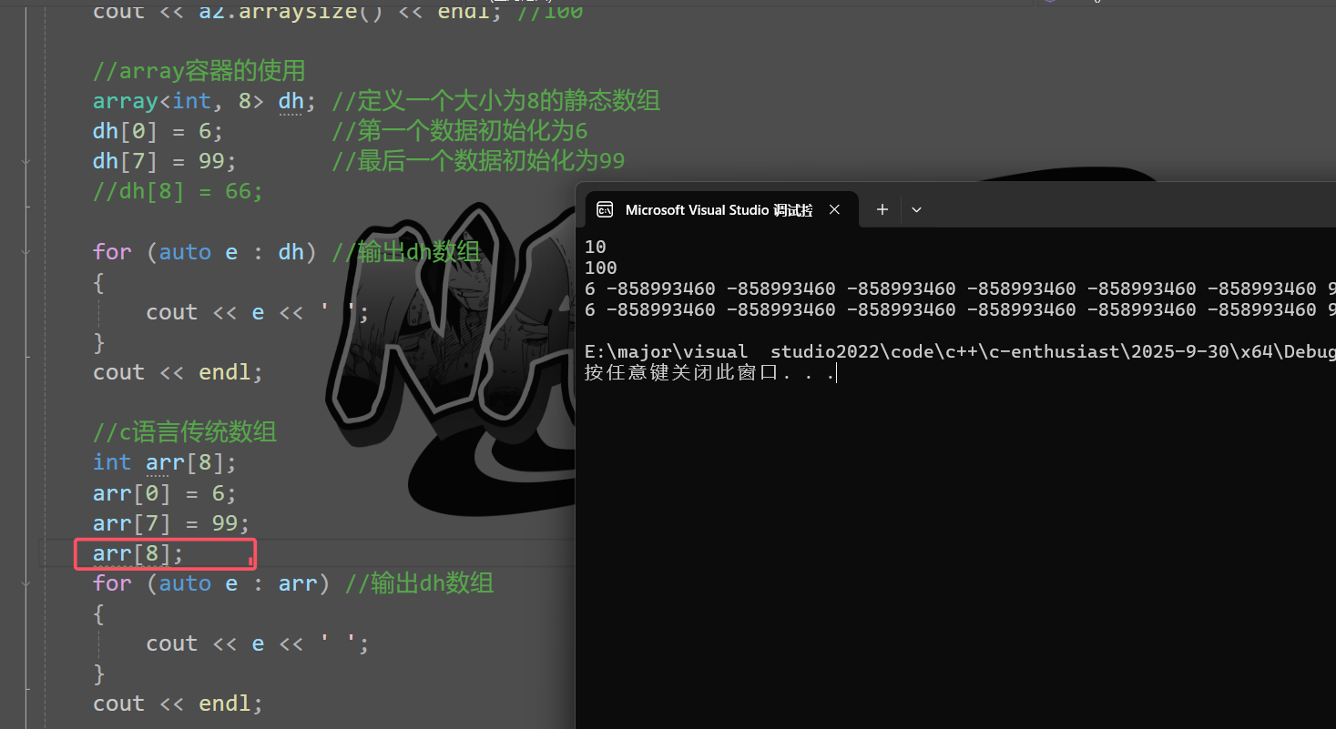 同样的,都没有进行初始化,而且c语言中的数组也支持array中的大部分数组,其实其中的不同就是array容器对越界的检查更加的严格,可以检查出越界读和越界写。