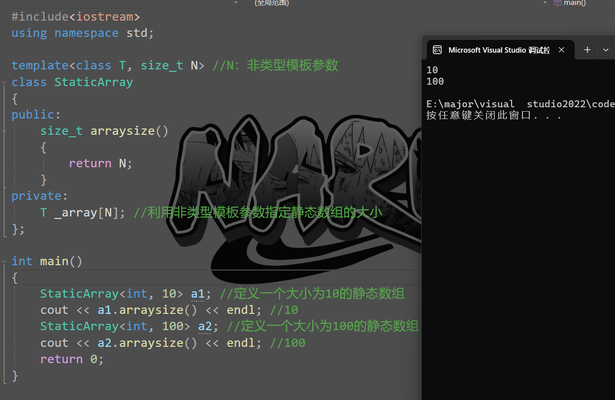 - 非类型模板参数:就是用一个常量作为类(函数)模板的一个参数,在类(函数)模板中可将该参数当成常量来使用。