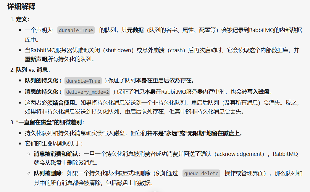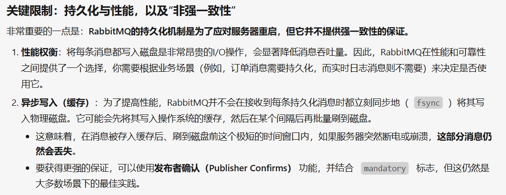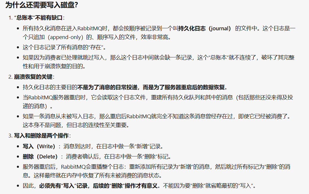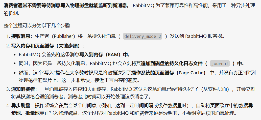 1.3.3 通知消费者:一旦消息被存入内存和页面缓存,RabbitMQ 就认为这条消息已经"持久化"了(从软件层面),并会立刻将其投递给合适的消费者。消费者此时就可以开始处理这条消息了。 可是消费者已经处理完了 还需要再批量写入磁盘么