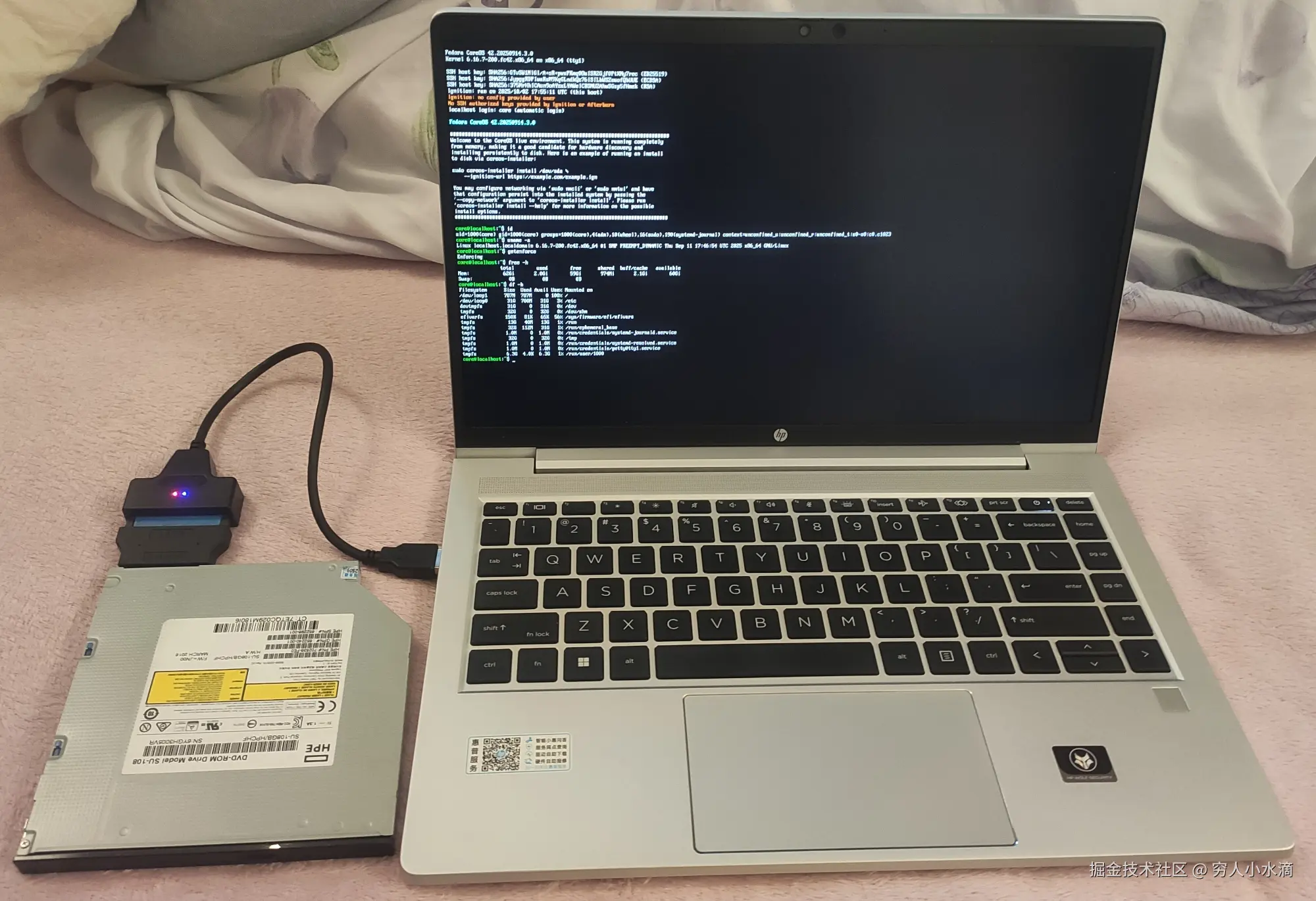 如图, 使用 USB 转 SATA 笔记本光驱启动 Fedora CoreOS. 启动后就进入 (root) 命令行了, 有很多工具可以使用 (比如 rsync, podman, fdisk). 就可以用于应急恢复系统, 或者重新安装系统了.