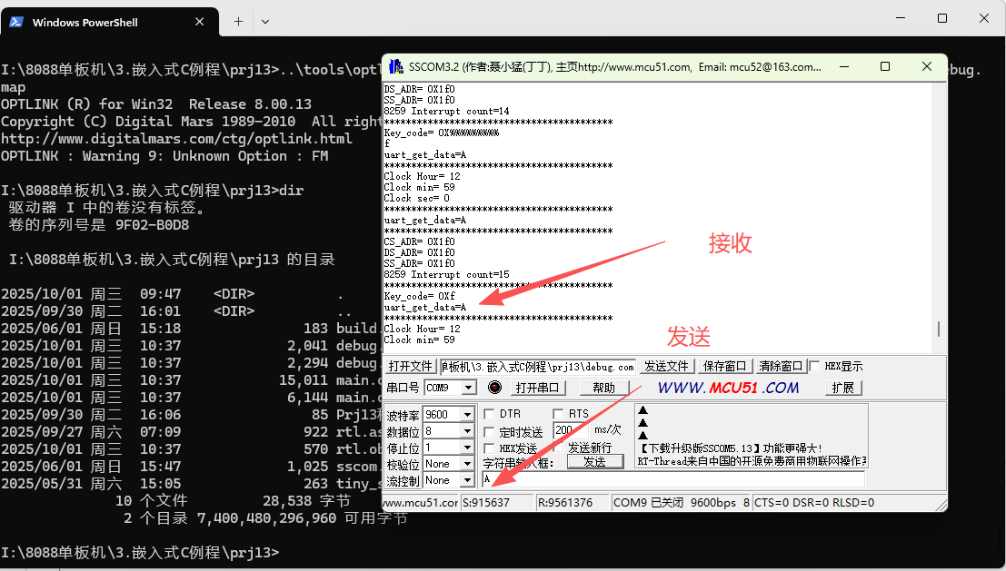 ; 功能: 接收字符并回显,显示中断触发与释放状态