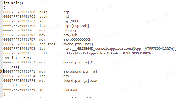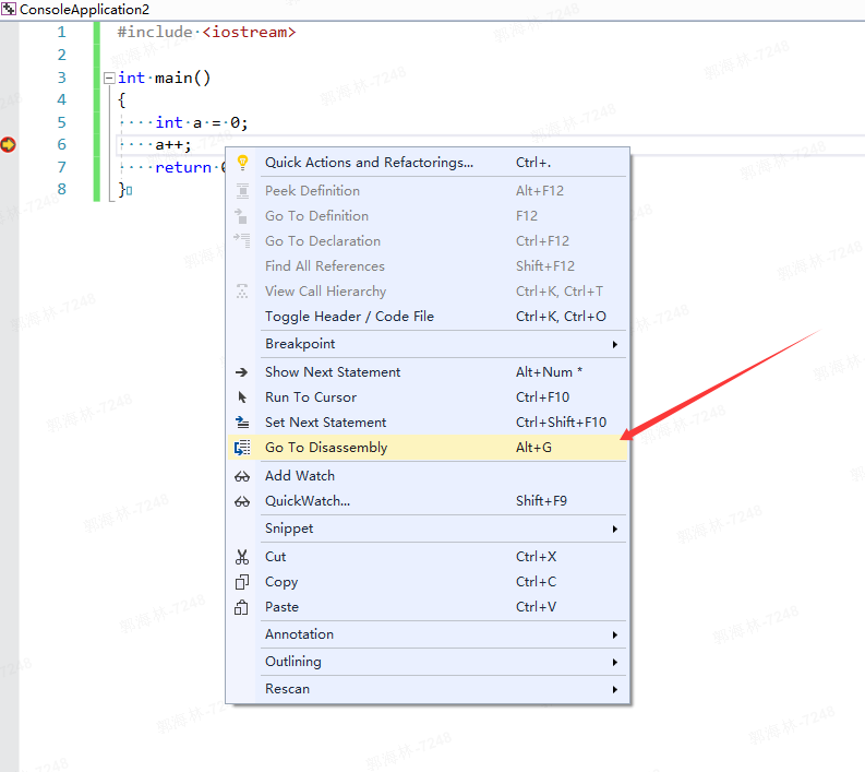 1、在a++代码下断点,断点触发时,右键菜单选择"Go to Disassembly"(汇编),就能看见汇编代码了。