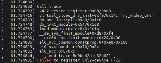 通过dmseg我们发现,上述程序在register v4l2-device的时候出现了错误。这里其实是由于没有给v4l2_dev设置名字,我们只要给 strcpy(g_v4l2_dev.name, "vir_v4l2");设置名字即可。