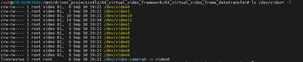 insmod 我们的驱动程序后会发现,ls /dev/video* -l 下面没有生成设备节点,但是在 ls /dev/swradio0 这个设备生成了节点,这是因为代码在 ret = video_register_device(&g_vir_dev, VFL_TYPE_SDR, -1);的时候传的type不对,生成错了设备节点,所以我们要将这个type改成VFL_TYPE_GRABBER 或者直接传0即可。结果如下图所示,video11是我们生成的节点。