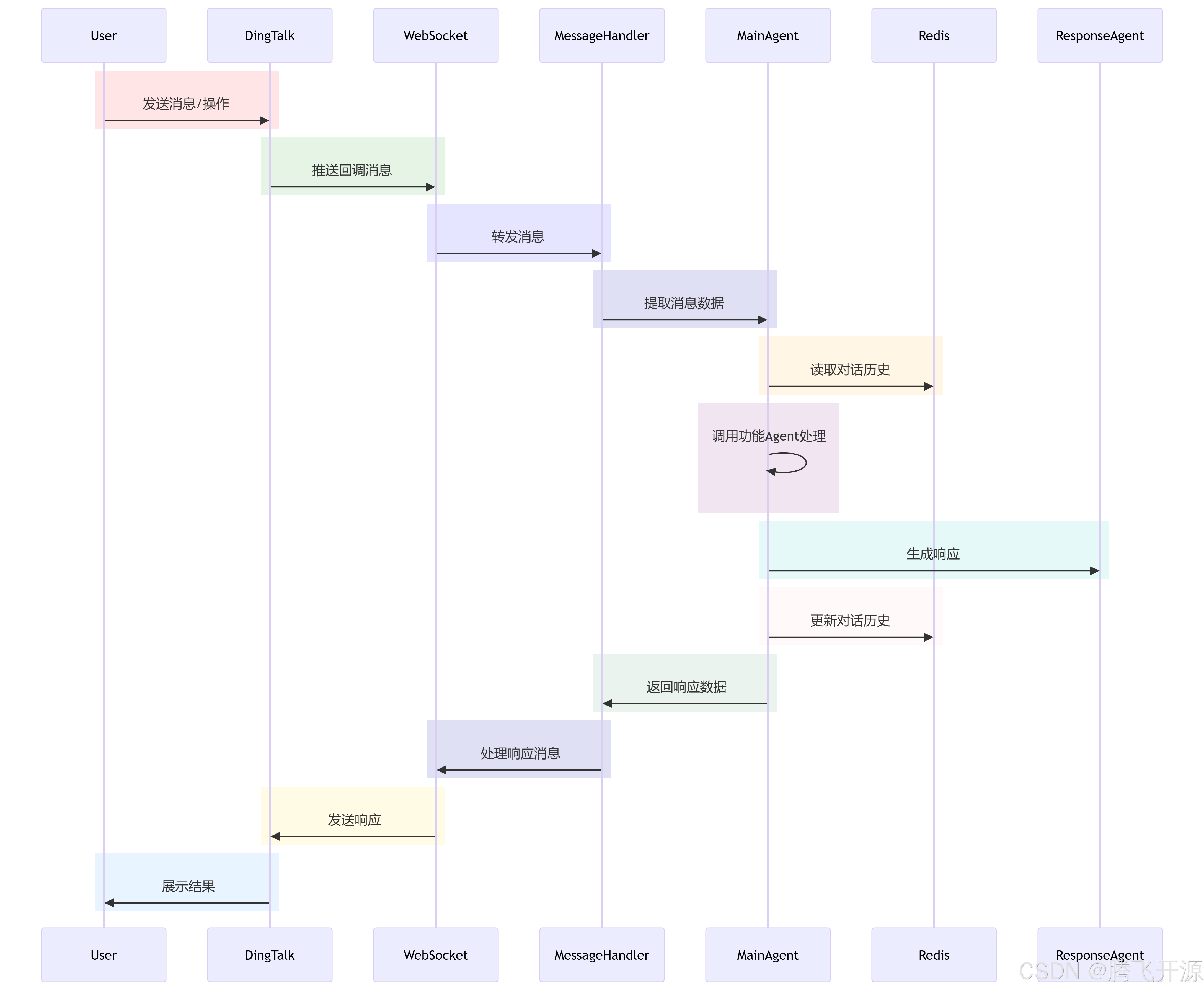 钉钉消息处理流程始于用户输入,消息经钉钉服务器安全验证后,通过WebSocket推送至系统。主控Agent(MainAgent)首先读取对话历史,再协调各功能Agent协同处理,最终生成并结合上下文与情感的自然响应。结果经格式化后,通过WebSocket返回并由钉钉客户端展示,同时更新对话记忆。