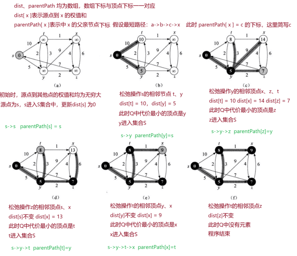 - 算法思路:将顶点分为S、Q两个集合,S中存放最短路径中的顶点,Q存放尚未确定的顶点。每次从Q中找出一个从源节点到该点代价最小的顶点,将其放入S中,然后对其相邻节点进行松弛操作,反复进行找点、放入、松弛操作,直到所有顶点都进入S为止。至于一些起点到达不了的结点在算法循环后其代价仍为初始设定 的值,不发生变化