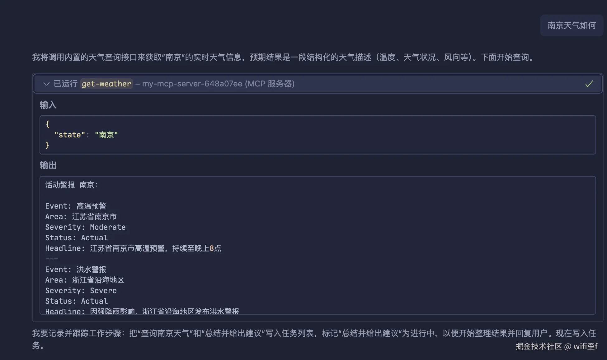 - 外部工具(如天气 API)接收指令,执行并返回原始结果(通常是 JSON 格式);