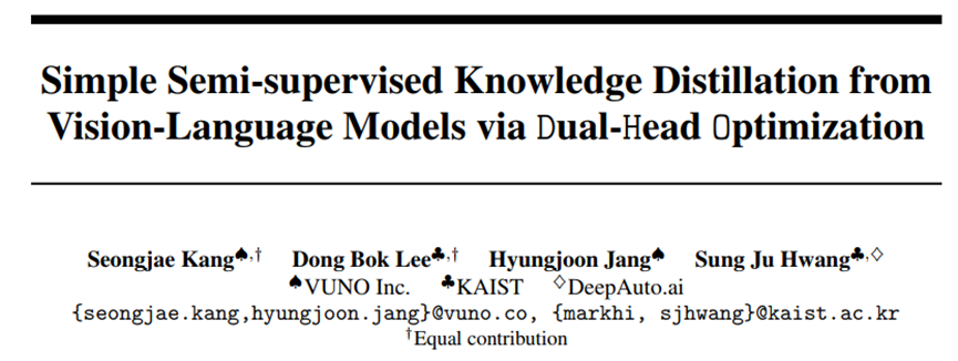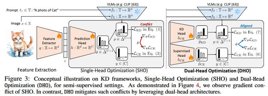 视觉语言模型(Vision-Language Models, VLMs)在各种视觉任务中取得了巨大成功,但由于其模型规模庞大和计算要求高,很难部署在移动设备等资源受限的环境中。知识蒸馏(Knowledge Distillation, KD)是一种有效的解决方案,但现有的VLM蒸馏方法通常涉及复杂的多阶段训练或额外的微调,增加了计算开销和优化难度。此外,在只有少量标注数据的半监督场景下,传统的单头知识蒸馏方法会因为来自标注数据的监督信号和来自教师模型的蒸馏信号之间的"梯度冲突"而表现不佳,导致特征学习效果受限。