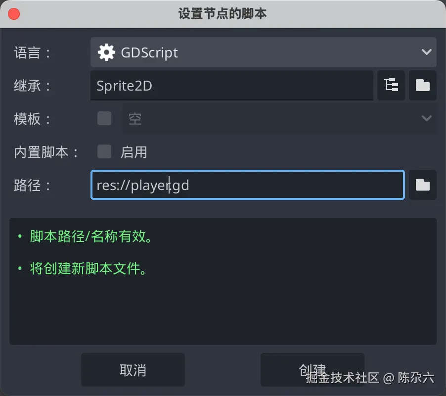 在弹出的窗口中设置脚本名称与路径,例如命名为 player.gd