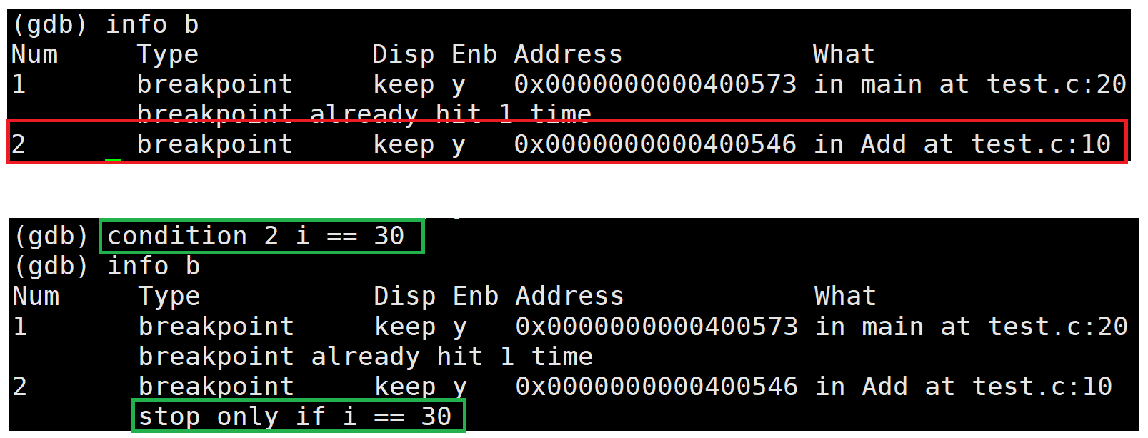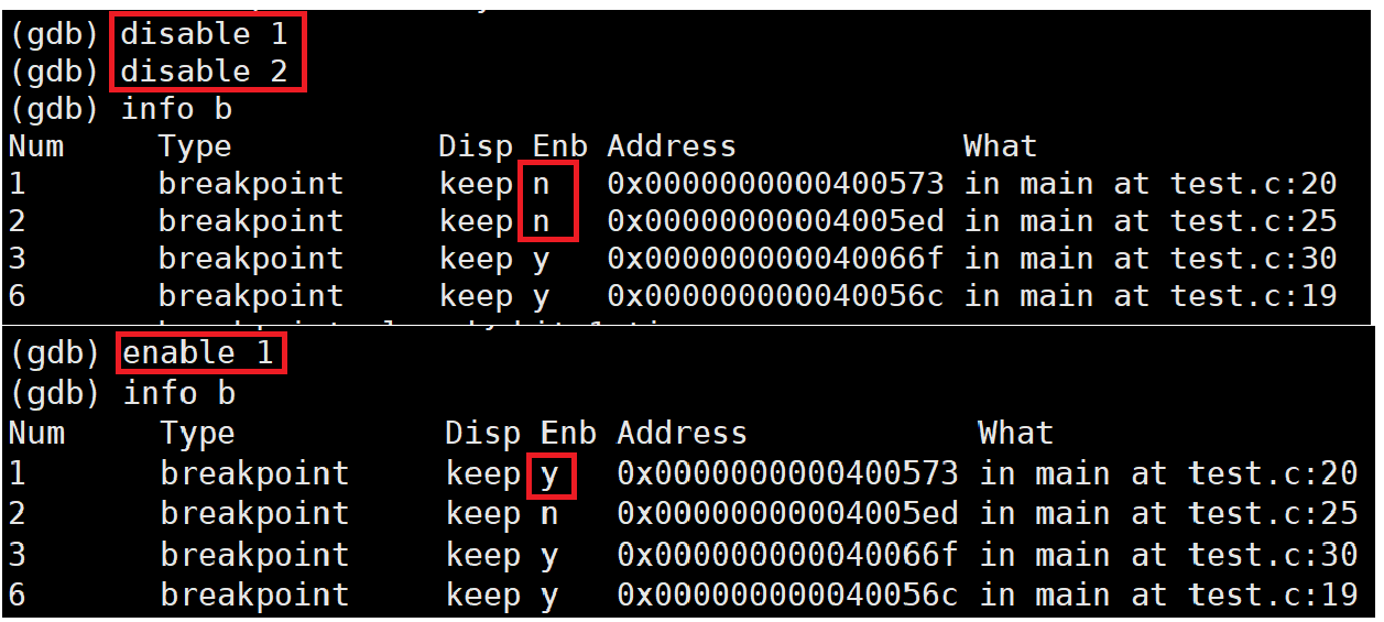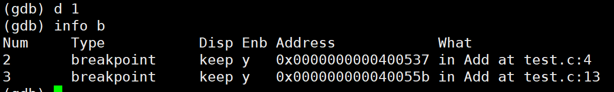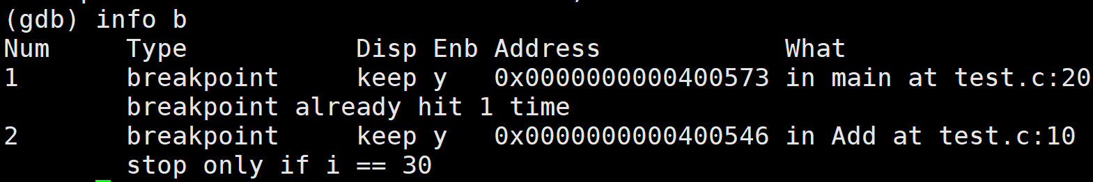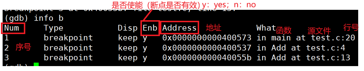 info b:查看断点信息,根据断点设置的先后顺序编号