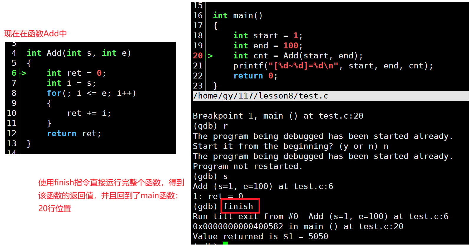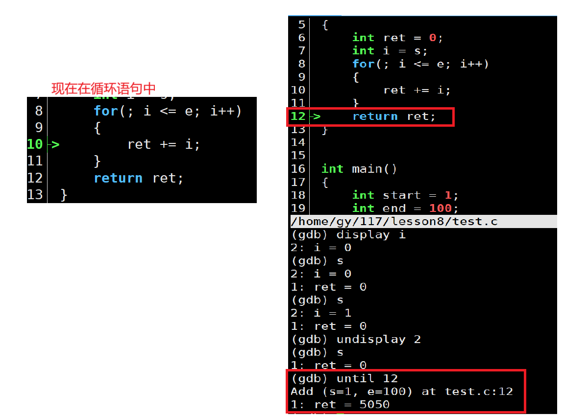 在函数中如果有一个循环语句,我们想直接一步运行完这个循环语句(这个区域的代码),使用指令:until 行号:直接运行到该行号位置