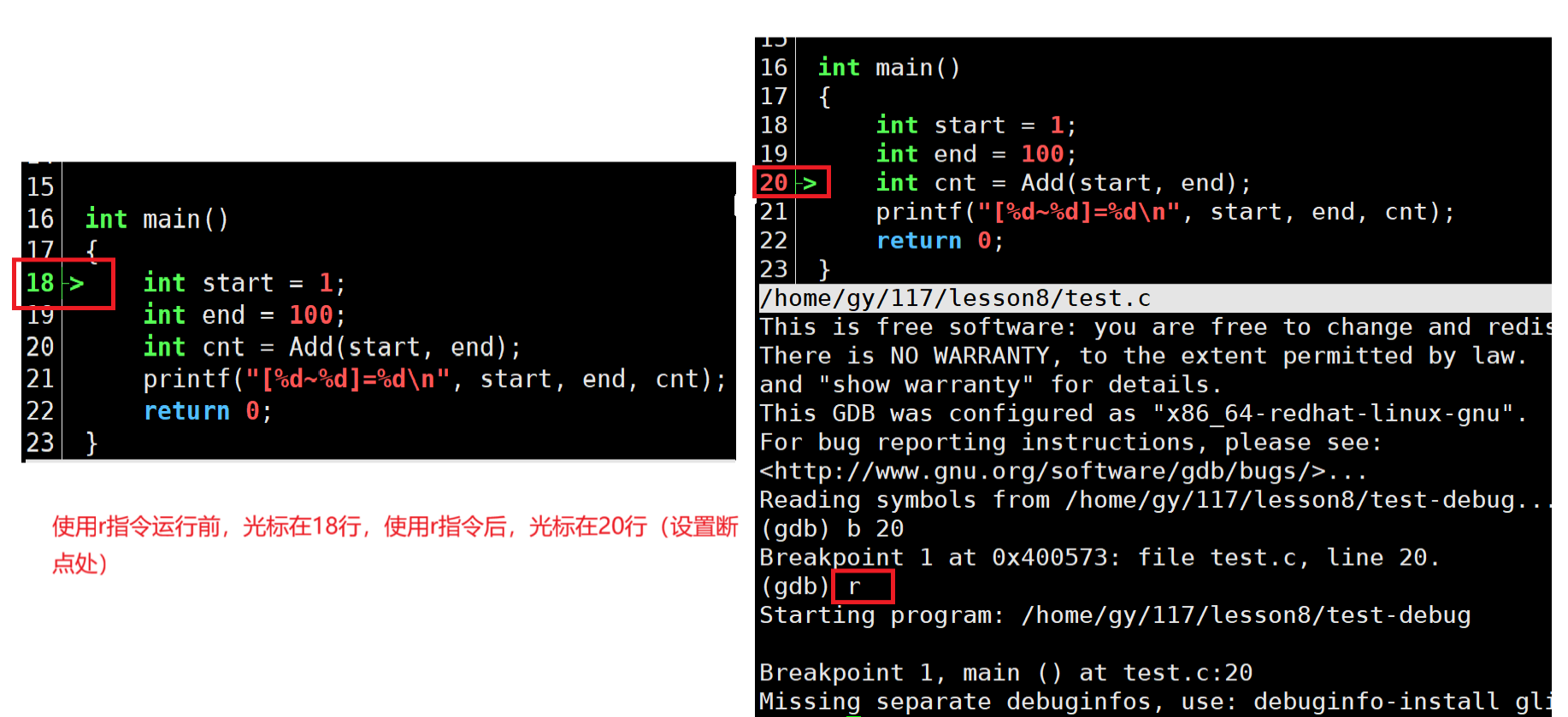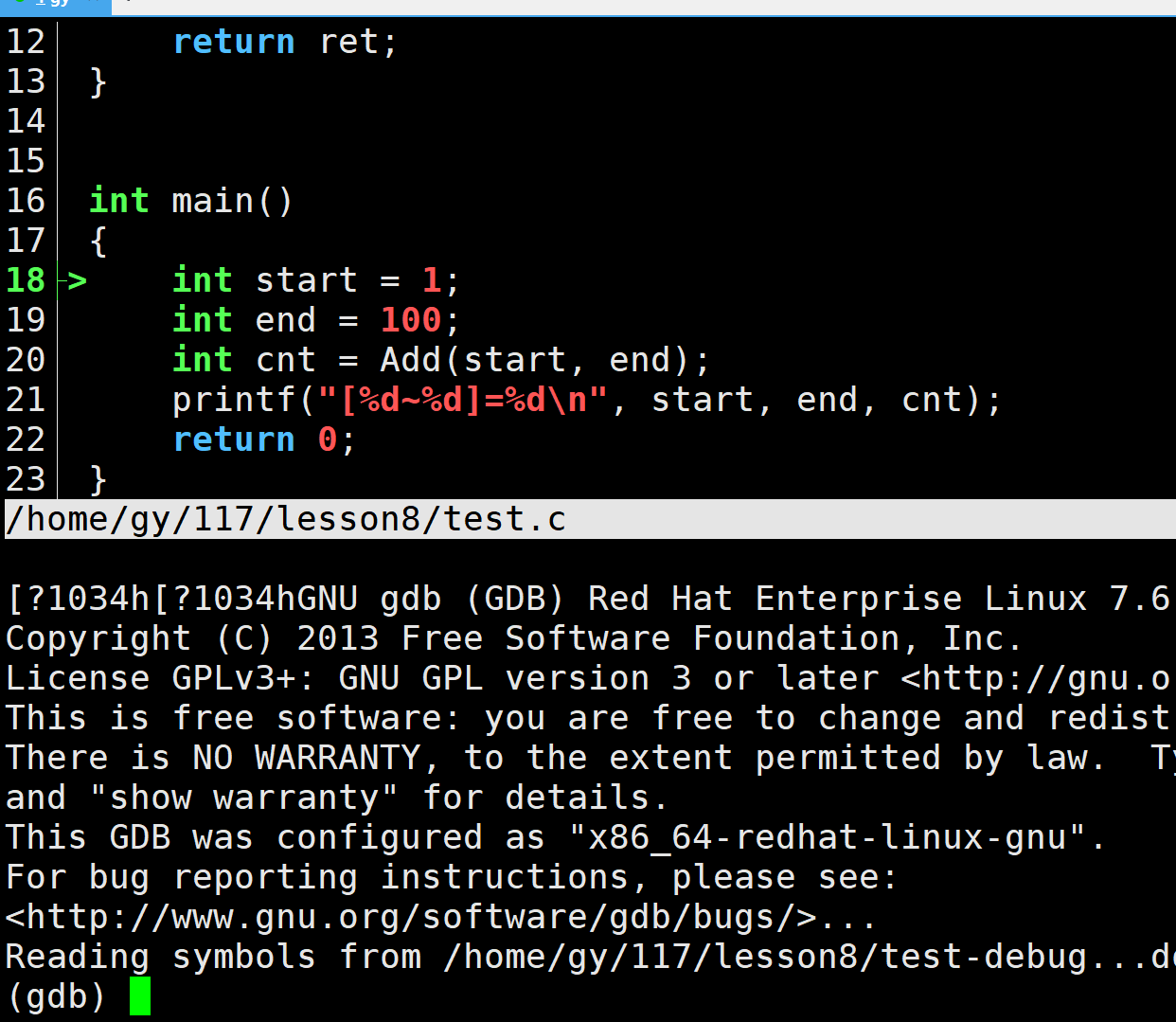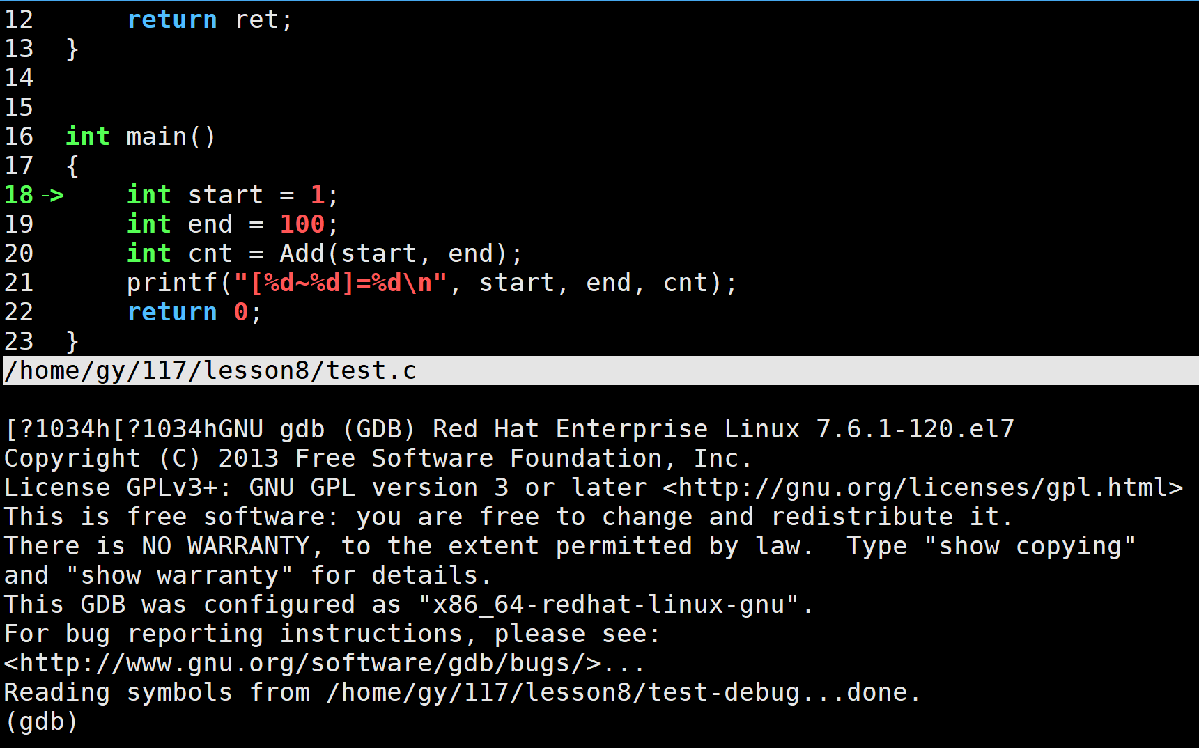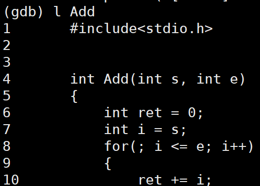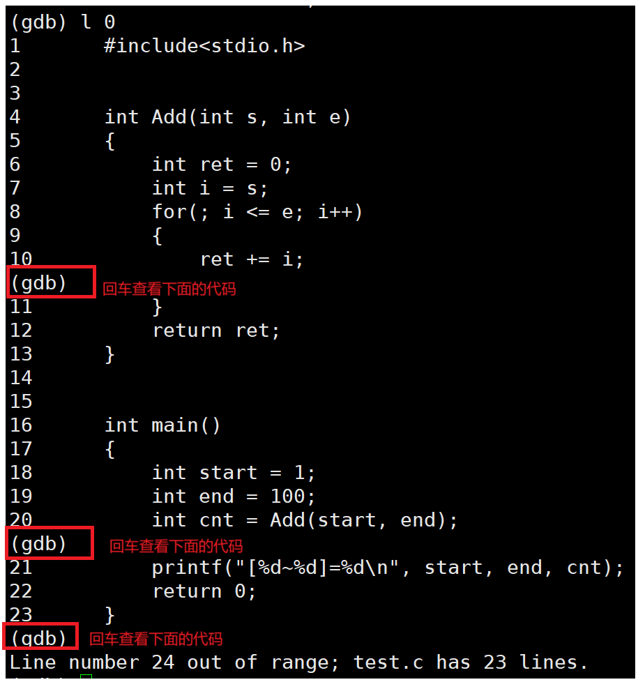 :会打印上下共n行代码,gdb会记录最近一次的命令,如果超查看完整代码,可以输入命令:l 0