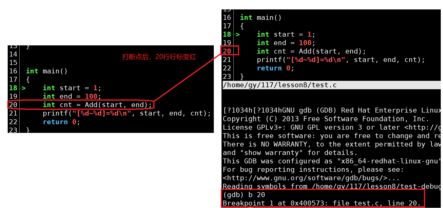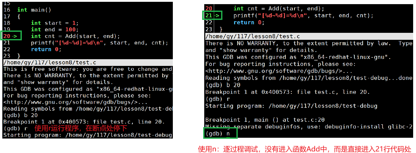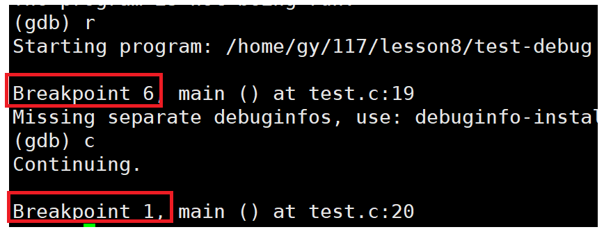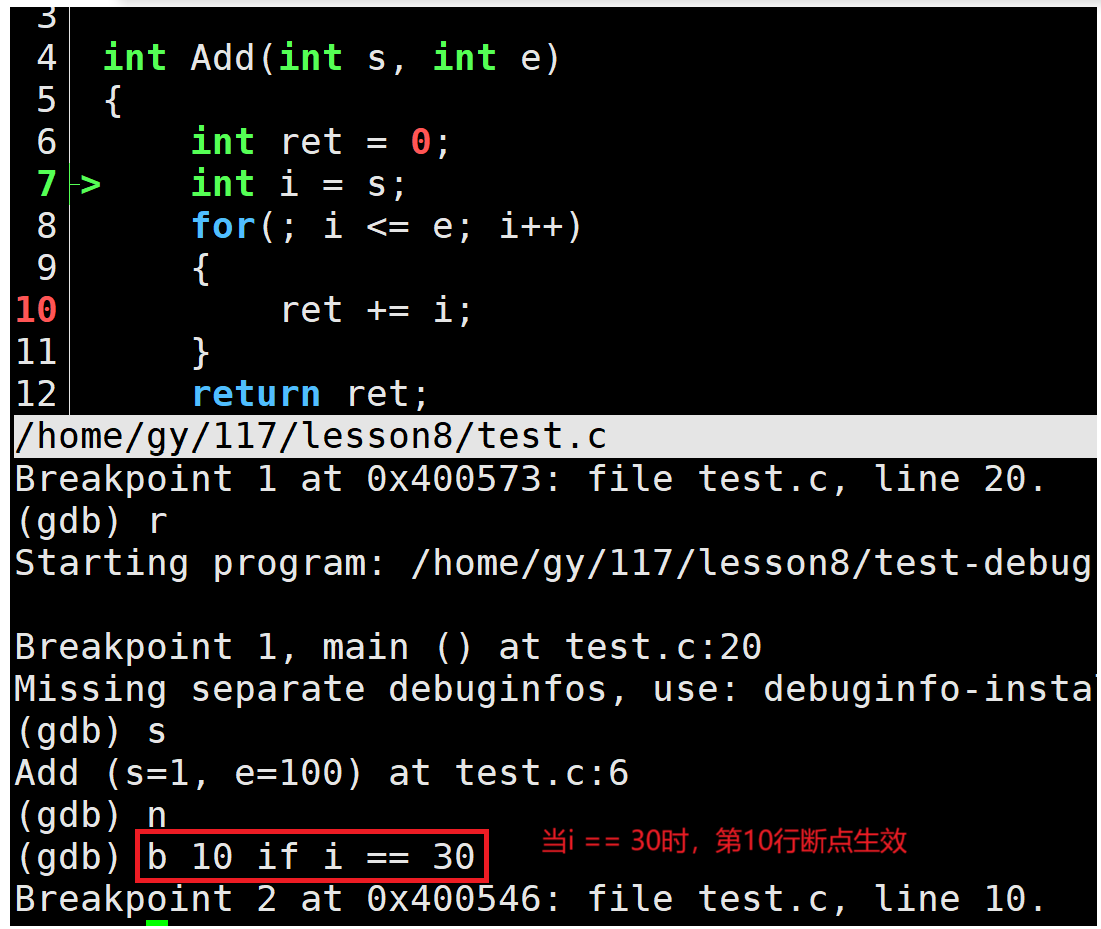 - b 文件名:行号,表示在文件行号为n的位置打断点