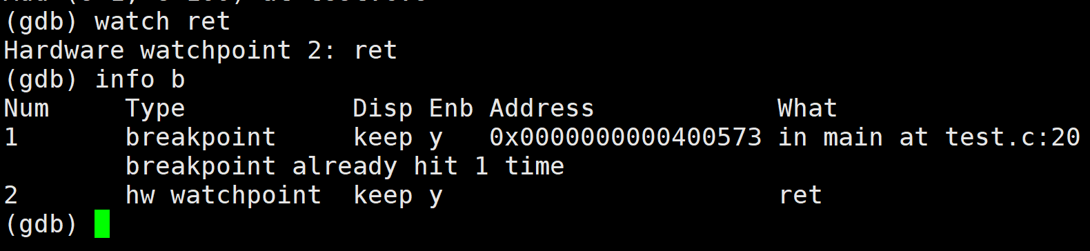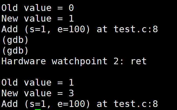 - 执行时监视⼀个表达式(如变量)的值。如果监视的表达式在程序运行期间的值发生变化,gdb会暂停程序的执行