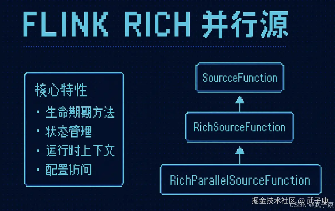 - 访问运行时上下文:通过 getRuntimeContext() 方法,RichSourceFunction 可以访问 Flink 的运行时上下文,获取并行度信息、任务名称、指标管理器,以及与状态相关的操作。
