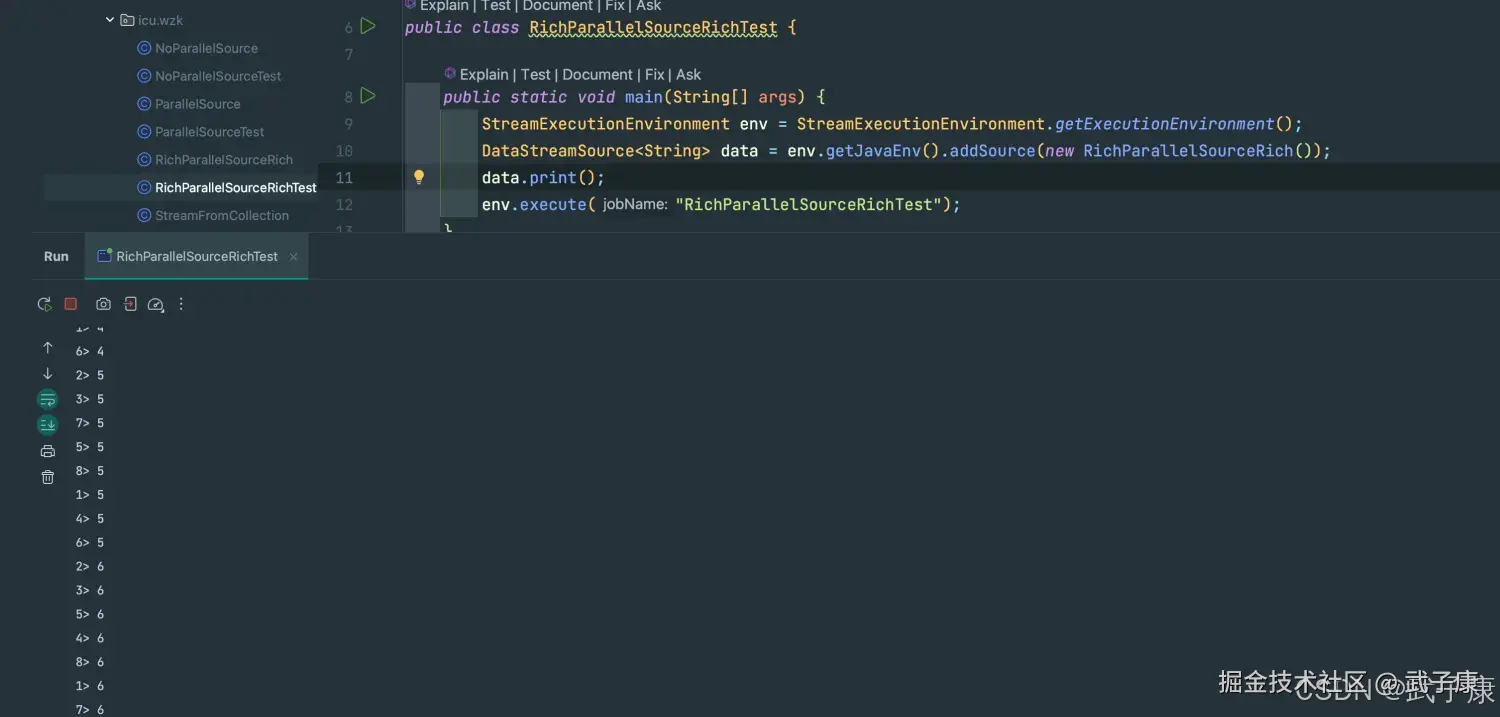 - 并行执行:与普通的 SourceFunction 类似,RichSourceFunction 也可以通过设置并行度来并行执行,这使得它可以处理大规模的数据 源。