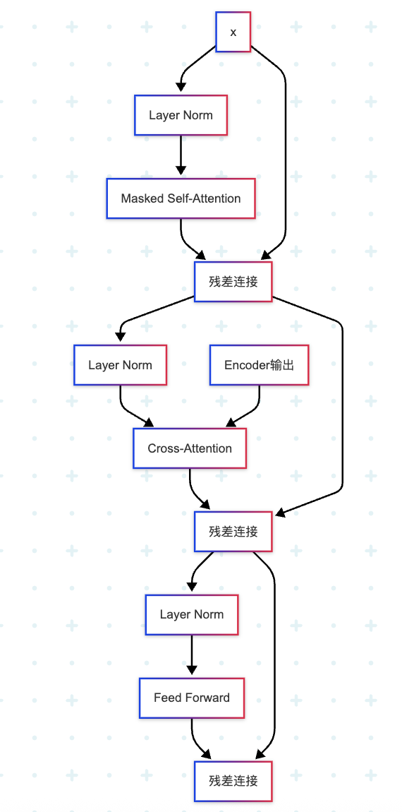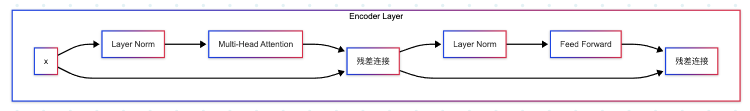 注意:这里采用的是Pre-Norm 结构,即先做Layer Norm,再做残差连接。原始论文使用的是Post-Norm(先残差连接,再Layer Norm),但实践证明Pre-Norm更稳定。