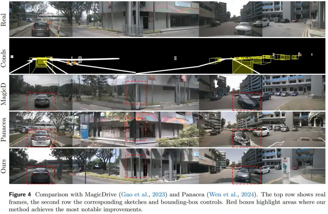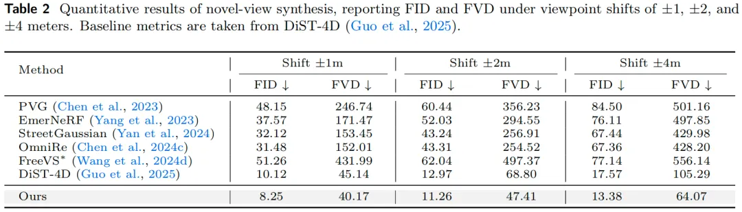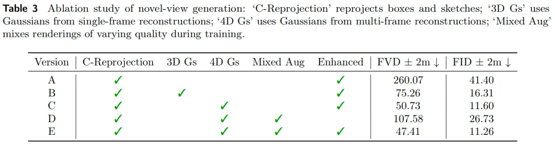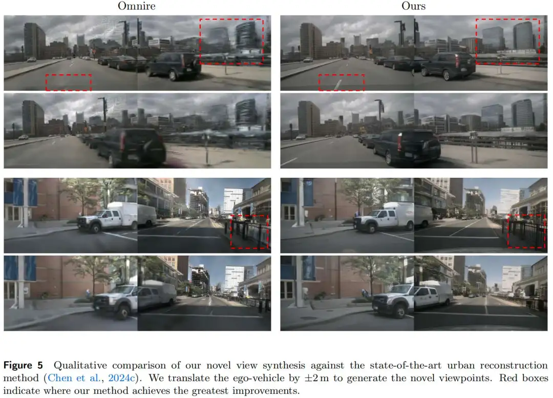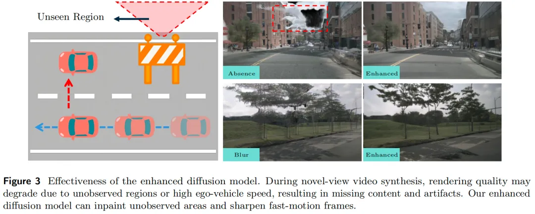 如图3所示(为便于理解),左上角新视角渲染因遮挡缺失天空区域,左下角渲染因强自车运动出现模糊;相比之下,我们的模型显著提升了最终渲染结果的保真度与清晰度。